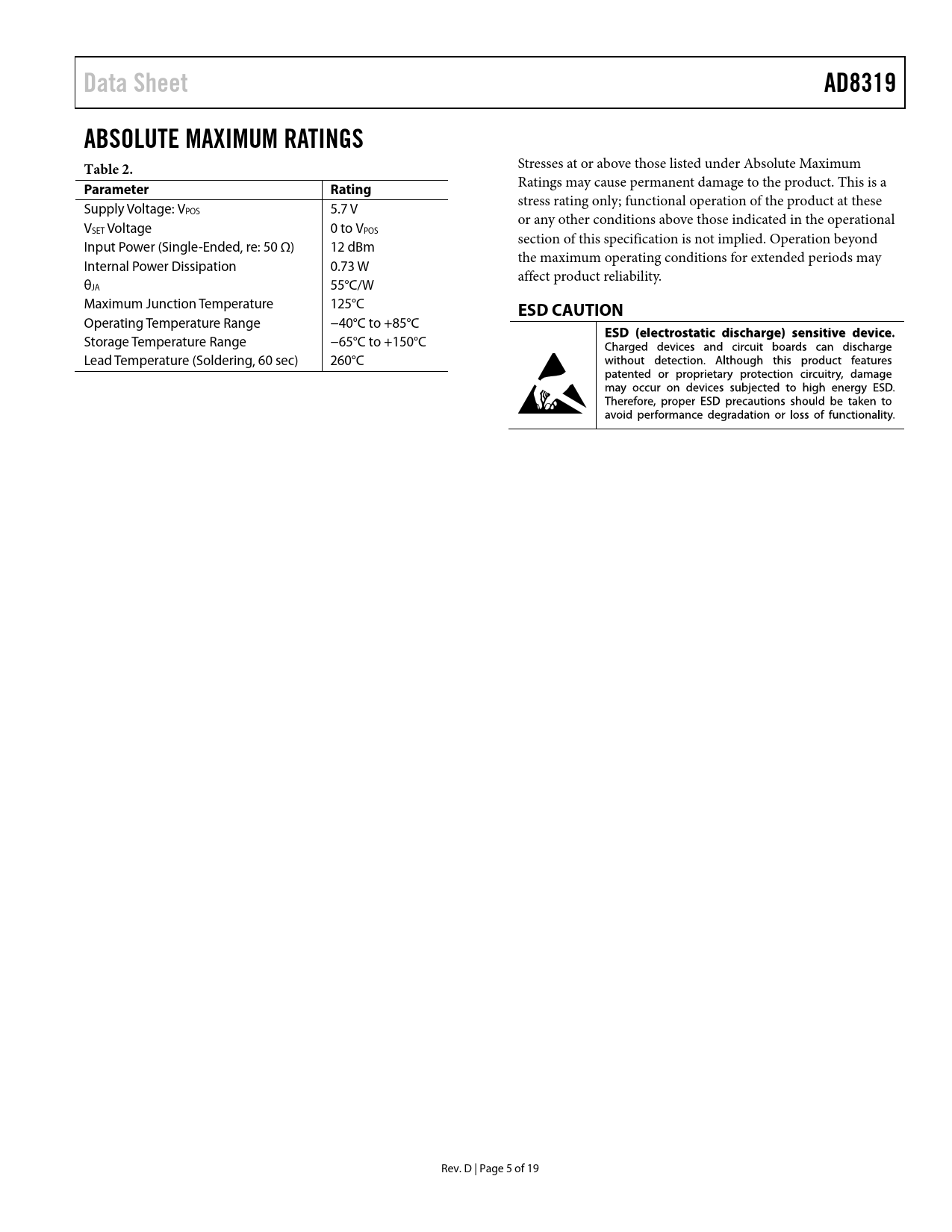 Data Sheet. AD8319. ABSOLUTE MAXIMUM RATINGS Table 2. Parameter. Rating. ESD CAUTION