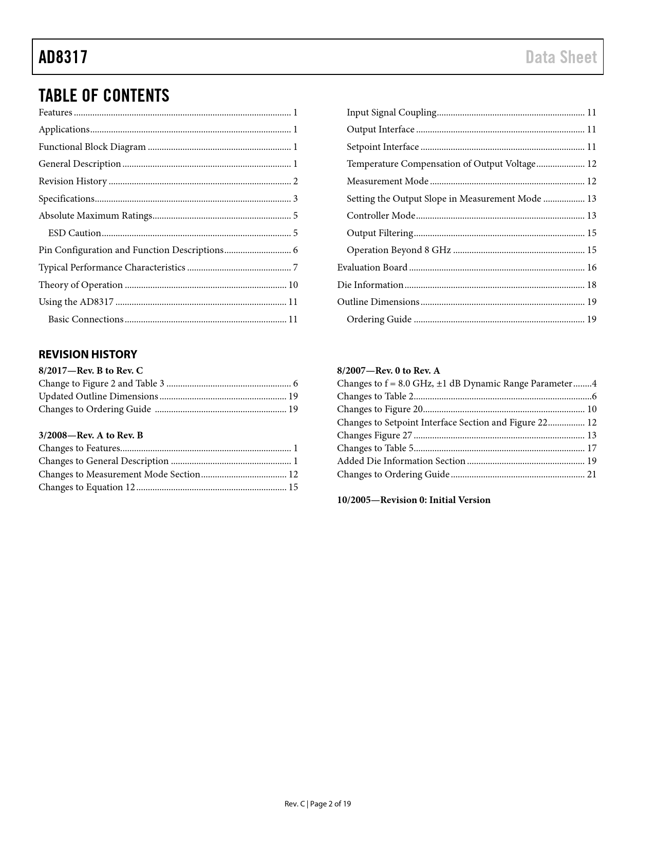 link to page 1 link to page 1 link to page 1 link to page 1 link to page 3 link to page 4 link to page 6 link to page 6 link to page 7 link to page 8 link to page 11 link to page 12 link to page 12 link to page 12 link to page 12 link to page 12 link to page 13 link to page 13 link to page 14 link to page 14 link to page 16 link to page 16 link to page 17 link to page 19 link to page 20 link to page 20 AD8317Data SheetTABLE OF CONTENTS Features .. 1 Input Signal Coupling .. 11 Applications ... 1 Output Interface ... 11 Functional Block Diagram .. 1 Setpoint Interface ... 11 General Description ... 1 Temperature Compensation of Output Voltage ... 12 Revision History ... 2 Measurement Mode ... 12 Specifications ... 3 Setting the Output Slope in Measurement Mode .. 13 Absolute Maximum Ratings .. 5 Controller Mode ... 13 ESD Caution .. 5 Output Filtering .. 15 Pin Configuration and Function Descriptions ... 6 Operation Beyond 8 GHz ... 15 Typical Performance Characteristics ... 7 Evaluation Board .. 16 Theory of Operation .. 10 Die Information .. 18 Using the AD8317 .. 11 Outline Dimensions ... 19 Basic Connections .. 11 Ordering Guide .. 19 REVISION HISTORY8/2017—Rev. B to Rev. C8/2007—Rev. 0 to Rev. A Change to Figure 2 and Table 3 .. 6 Changes to f = 8.0 GHz, ±1 dB Dynamic Range Parameter .. 4 Updated Outline Dimensions ... 19 Changes to Table 2 ... 6 Changes to Ordering Guide ... 19 Changes to Figure 20 .. 10 Changes to Setpoint Interface Section and Figure 22 .. 12 3/2008—Rev. A to Rev. B Changes Figure 27 .. 13 Changes to Features .. 1 Changes to Table 5 .. 17 Changes to General Description .. 1 Added Die Information Section ... 19 Changes to Measurement Mode Section ... 12 Changes to Ordering Guide .. 21 Changes to Equation 12 ... 15 10/2005—Revision 0: Initial Version Rev. C | Page 2 of 19 Document Outline FEATURES APPLICATIONS FUNCTIONAL BLOCK DIAGRAM GENERAL DESCRIPTION TABLE OF CONTENTS REVISION HISTORY SPECIFICATIONS ABSOLUTE MAXIMUM RATINGS ESD CAUTION PIN CONFIGURATION AND FUNCTION DESCRIPTIONS TYPICAL PERFORMANCE CHARACTERISTICS THEORY OF OPERATION USING THE AD8317 BASIC CONNECTIONS INPUT SIGNAL COUPLING OUTPUT INTERFACE SETPOINT INTERFACE TEMPERATURE COMPENSATION OF OUTPUT VOLTAGE MEASUREMENT MODE SETTING THE OUTPUT SLOPE IN MEASUREMENT MODE CONTROLLER MODE OUTPUT FILTERING OPERATION BEYOND 8 GHz EVALUATION BOARD DIE INFORMATION OUTLINE DIMENSIONS ORDERING GUIDE