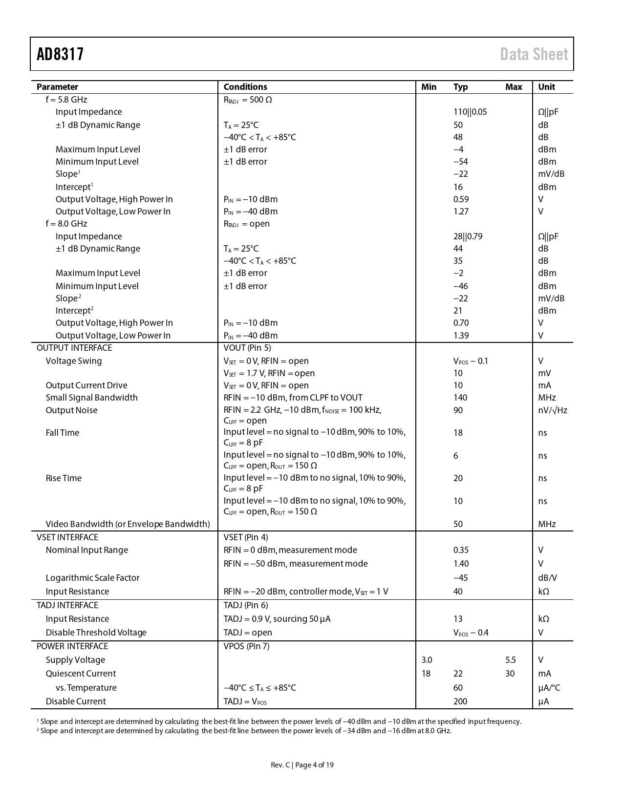 AD8317Data SheetParameterConditionsMinTypMaxUnit f = 5.8 GHz RTADJ = 500 Ω Input Impedance 110||0.05 Ω||pF ±1 dB Dynamic Range TA = 25°C 50 dB −40°C < TA < +85°C 48 dB Maximum Input Level ±1 dB error −4 dBm Minimum Input Level ±1 dB error −54 dBm Slope1 −22 mV/dB Intercept1 16 dBm Output Voltage, High Power In PIN = −10 dBm 0.59 V Output Voltage, Low Power In PIN = −40 dBm 1.27 V f = 8.0 GHz RTADJ = open Input Impedance 28||0.79 Ω||pF ±1 dB Dynamic Range TA = 25°C 44 dB −40°C < TA < +85°C 35 dB Maximum Input Level ±1 dB error −2 dBm Minimum Input Level ±1 dB error −46 dBm Slope2 −22 mV/dB Intercept2 21 dBm Output Voltage, High Power In PIN = −10 dBm 0.70 V Output Voltage, Low Power In PIN = −40 dBm 1.39 V OUTPUT INTERFACE VOUT (Pin 5) Voltage Swing VSET = 0 V, RFIN = open VPOS − 0.1 V VSET = 1.7 V, RFIN = open 10 mV Output Current Drive VSET = 0 V, RFIN = open 10 mA Small Signal Bandwidth RFIN = −10 dBm, from CLPF to VOUT 140 MHz Output Noise RFIN = 2.2 GHz, −10 dBm, fNOISE = 100 kHz, 90 nV/√Hz CLPF = open Fall Time Input level = no signal to −10 dBm, 90% to 10%, 18 ns CLPF = 8 pF Input level = no signal to −10 dBm, 90% to 10%, 6 ns CLPF = open, ROUT = 150 Ω Rise Time Input level = −10 dBm to no signal, 10% to 90%, 20 ns CLPF = 8 pF Input level = −10 dBm to no signal, 10% to 90%, 10 ns CLPF = open, ROUT = 150 Ω Video Bandwidth (or Envelope Bandwidth) 50 MHz VSET INTERFACE VSET (Pin 4) Nominal Input Range RFIN = 0 dBm, measurement mode 0.35 V RFIN = −50 dBm, measurement mode 1.40 V Logarithmic Scale Factor −45 dB/V Input Resistance RFIN = −20 dBm, controller mode, VSET = 1 V 40 kΩ TADJ INTERFACE TADJ (Pin 6) Input Resistance TADJ = 0.9 V, sourcing 50 μA 13 kΩ Disable Threshold Voltage TADJ = open VPOS − 0.4 V POWER INTERFACE VPOS (Pin 7) Supply Voltage 3.0 5.5 V Quiescent Current 18 22 30 mA vs. Temperature −40°C ≤ TA ≤ +85°C 60 µA/°C Disable Current TADJ = VPOS 200 µA 1 Slope and intercept are determined by calculating the best-fit line between the power levels of −40 dBm and −10 dBm at the specified input frequency. 2 Slope and intercept are determined by calculating the best-fit line between the power levels of −34 dBm and −16 dBm at 8.0 GHz. Rev. C | Page 4 of 19 Document Outline FEATURES APPLICATIONS FUNCTIONAL BLOCK DIAGRAM GENERAL DESCRIPTION TABLE OF CONTENTS REVISION HISTORY SPECIFICATIONS ABSOLUTE MAXIMUM RATINGS ESD CAUTION PIN CONFIGURATION AND FUNCTION DESCRIPTIONS TYPICAL PERFORMANCE CHARACTERISTICS THEORY OF OPERATION USING THE AD8317 BASIC CONNECTIONS INPUT SIGNAL COUPLING OUTPUT INTERFACE SETPOINT INTERFACE TEMPERATURE COMPENSATION OF OUTPUT VOLTAGE MEASUREMENT MODE SETTING THE OUTPUT SLOPE IN MEASUREMENT MODE CONTROLLER MODE OUTPUT FILTERING OPERATION BEYOND 8 GHz EVALUATION BOARD DIE INFORMATION OUTLINE DIMENSIONS ORDERING GUIDE