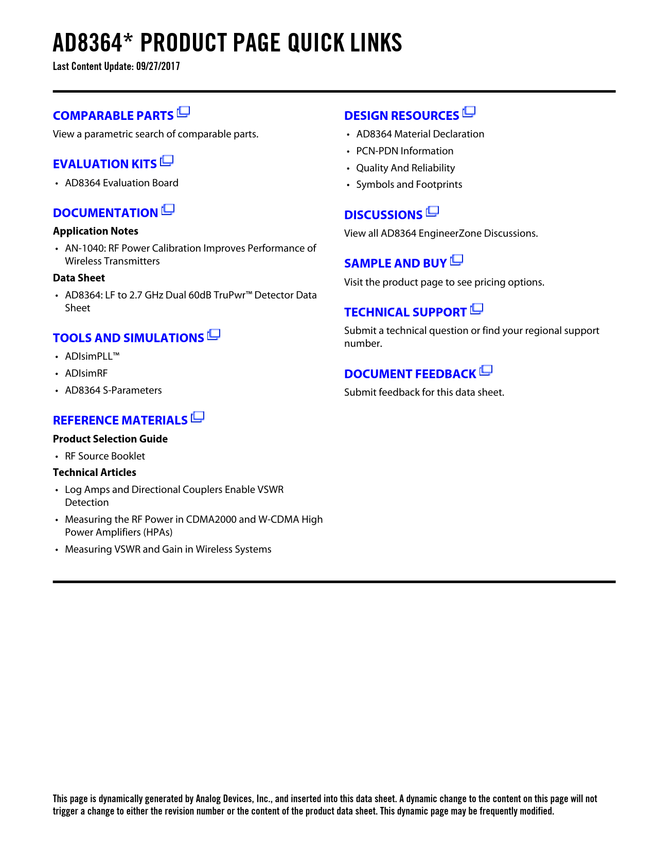 AD8364* PRODUCT PAGE QUICK LINKS Last Content Update: 09/27/2017COMPARABLE PARTSDESIGN RESOURCES View a parametric search of comparable parts. • AD8364 Material Declaration • PCN-PDN Information EVALUATION KITS • Quality And Reliability • AD8364 Evaluation Board • Symbols and Footprints DOCUMENTATIONDISCUSSIONSApplication Notes View all AD8364 EngineerZone Discussions. • AN-1040: RF Power Calibration Improves Performance of Wireless Transmitters SAMPLE AND BUYData Sheet Visit the product page to see pricing options. • AD8364: LF to 2.7 GHz Dual 60dB TruPwr™ Detector Data Sheet TECHNICAL SUPPORT Submit a technical question or find your regional support TOOLS AND SIMULATIONS number. • ADIsimPLL™ • ADIsimRF DOCUMENT FEEDBACK • AD8364 S-Parameters Submit feedback for this data sheet. REFERENCE MATERIALSProduct Selection Guide • RF Source Booklet Technical Articles • Log Amps and Directional Couplers Enable VSWR Detection • Measuring the RF Power in CDMA2000 and W-CDMA High Power Amplifiers (HPAs) • Measuring VSWR and Gain in Wireless Systems This page is dynamically generated by Analog Devices, Inc., and inserted into this data sheet. A dynamic change to the content on this page will not trigger a change to either the revision number or the content of the product data sheet. This dynamic page may be frequently modified. Document Outline FEATURES APPLICATIONS FUNCTIONAL BLOCK DIAGRAM GENERAL DESCRIPTION REVISION HISTORY SPECIFICATIONS ABSOLUTE MAXIMUM RATINGS ESD CAUTION PIN CONFIGURATION AND FUNCTION DESCRIPTIONS TYPICAL PERFORMANCE CHARACTERISTICS THEORY OF OPERATION SQUARE LAW DETECTOR AND AMPLITUDE TARGET RF INPUT INTERFACE OFFSET COMPENSATION TEMPERATURE SENSOR INTERFACE VREF INTERFACE POWER-DOWN INTERFACE VST[A, B] INTERFACE OUT[A, B, P, N] OUTPUTS MEASUREMENT CHANNEL DIFFERENCE OUTPUT USING OUT[P, N] CONTROLLER MODE RF MEASUREMENT MODE BASIC CONNECTIONS CONTROLLER MODE BASIC CONNECTIONS Automatic Power Control Automatic Gain Control CONSTANT OUTPUT POWER OPERATION GAIN-STABLE TRANSMITTER/RECEIVER TEMPERATURE COMPENSATION ADJUSTMENT DEVICE CALIBRATION AND ERROR CALCULATION SELECTING CALIBRATION POINTS TO IMPROVE ACCURACY OVER A REDUCED RANGE CHANNEL ISOLATION ALTERING THE SLOPE CHOOSING THE RIGHT VALUE FOR CHP[A, B] AND CLP[A, B] RF BURST RESPONSE TIME SINGLE-ENDED INPUT OPERATION PRINTED CIRCUIT BOARD CONSIDERATIONS PACKAGE CONSIDERATIONS DESCRIPTION OF CHARACTERIZATION BASIS FOR ERROR CALCULATIONS EVALUATION BOARD OUTLINE DIMENSIONS ORDERING GUIDE