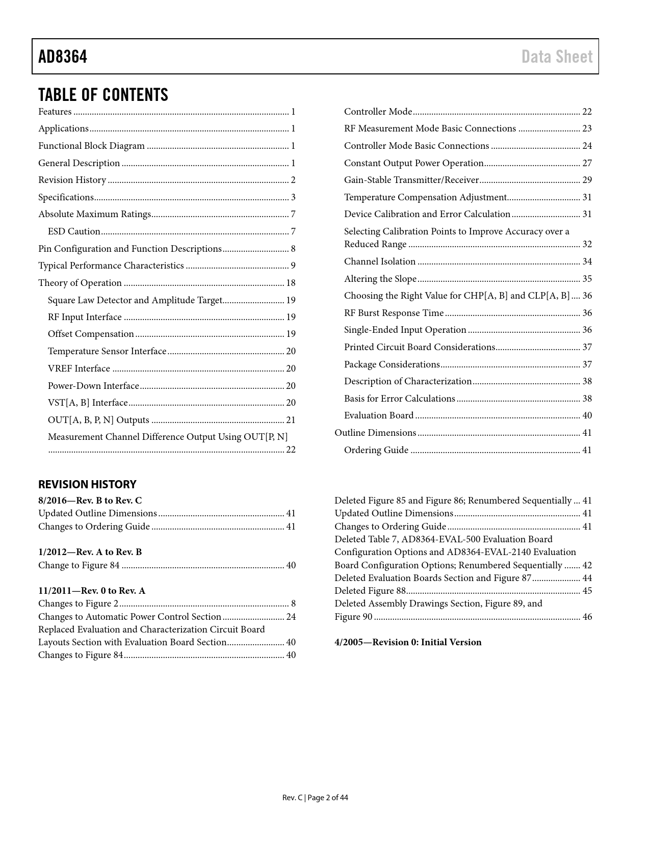 Páginas / Página45 / 3 — AD8364. Data Sheet. TABLE OF CONTENTS. REVISION HISTORY 8/2016—Rev. B to …