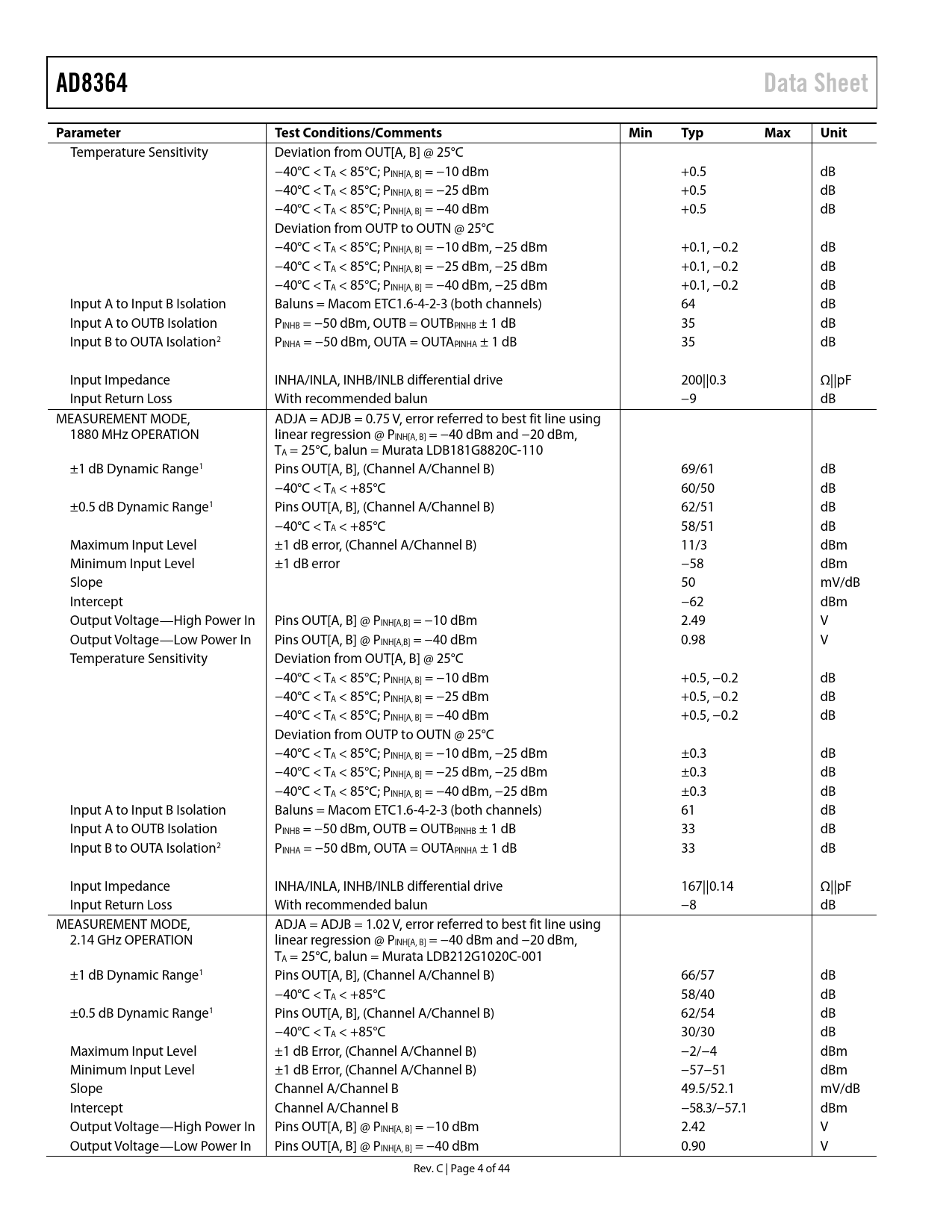 link to page 7 link to page 7 link to page 7 link to page 7 link to page 7 link to page 7 AD8364Data SheetParameterTest Conditions/CommentsMinTypMaxUnit Temperature Sensitivity Deviation from OUT[A, B] @ 25°C −40°C < TA < 85°C; PINH[A, B] = −10 dBm +0.5 dB −40°C < TA < 85°C; PINH[A, B] = −25 dBm +0.5 dB −40°C < TA < 85°C; PINH[A, B] = −40 dBm +0.5 dB Deviation from OUTP to OUTN @ 25°C −40°C < TA < 85°C; PINH[A, B] = −10 dBm, −25 dBm +0.1, −0.2 dB −40°C < TA < 85°C; PINH[A, B] = −25 dBm, −25 dBm +0.1, −0.2 dB −40°C < TA < 85°C; PINH[A, B] = −40 dBm, −25 dBm +0.1, −0.2 dB Input A to Input B Isolation Baluns = Macom ETC1.6-4-2-3 (both channels) 64 dB Input A to OUTB Isolation PINHB = −50 dBm, OUTB = OUTBPINHB ± 1 dB 35 dB Input B to OUTA Isolation2 PINHA = −50 dBm, OUTA = OUTAPINHA ± 1 dB 35 dB Input Impedance INHA/INLA, INHB/INLB differential drive 200||0.3 Ω||pF Input Return Loss With recommended balun −9 dB MEASUREMENT MODE, ADJA = ADJB = 0.75 V, error referred to best fit line using 1880 MHz OPERATION linear regression @ PINH[A, B] = −40 dBm and −20 dBm, TA = 25°C, balun = Murata LDB181G8820C-110 ±1 dB Dynamic Range1 Pins OUT[A, B], (Channel A/Channel B) 69/61 dB −40°C < TA < +85°C 60/50 dB ±0.5 dB Dynamic Range1 Pins OUT[A, B], (Channel A/Channel B) 62/51 dB −40°C < TA < +85°C 58/51 dB Maximum Input Level ±1 dB error, (Channel A/Channel B) 11/3 dBm Minimum Input Level ±1 dB error −58 dBm Slope 50 mV/dB Intercept −62 dBm Output Voltage—High Power In Pins OUT[A, B] @ PINH[A,B] = −10 dBm 2.49 V Output Voltage—Low Power In Pins OUT[A, B] @ PINH[A,B] = −40 dBm 0.98 V Temperature Sensitivity Deviation from OUT[A, B] @ 25°C −40°C < TA < 85°C; PINH[A, B] = −10 dBm +0.5, −0.2 dB −40°C < TA < 85°C; PINH[A, B] = −25 dBm +0.5, −0.2 dB −40°C < TA < 85°C; PINH[A, B] = −40 dBm +0.5, −0.2 dB Deviation from OUTP to OUTN @ 25°C −40°C < TA < 85°C; PINH[A, B] = −10 dBm, −25 dBm ±0.3 dB −40°C < TA < 85°C; PINH[A, B] = −25 dBm, −25 dBm ±0.3 dB −40°C < TA < 85°C; PINH[A, B] = −40 dBm, −25 dBm ±0.3 dB Input A to Input B Isolation Baluns = Macom ETC1.6-4-2-3 (both channels) 61 dB Input A to OUTB Isolation PINHB = −50 dBm, OUTB = OUTBPINHB ± 1 dB 33 dB Input B to OUTA Isolation2 PINHA = −50 dBm, OUTA = OUTAPINHA ± 1 dB 33 dB Input Impedance INHA/INLA, INHB/INLB differential drive 167||0.14 Ω||pF Input Return Loss With recommended balun −8 dB MEASUREMENT MODE, ADJA = ADJB = 1.02 V, error referred to best fit line using 2.14 GHz OPERATION linear regression @ PINH[A, B] = −40 dBm and −20 dBm, TA = 25°C, balun = Murata LDB212G1020C-001 ±1 dB Dynamic Range1 Pins OUT[A, B], (Channel A/Channel B) 66/57 dB −40°C < TA < +85°C 58/40 dB ±0.5 dB Dynamic Range1 Pins OUT[A, B], (Channel A/Channel B) 62/54 dB −40°C < TA < +85°C 30/30 dB Maximum Input Level ±1 dB Error, (Channel A/Channel B) −2/−4 dBm Minimum Input Level ±1 dB Error, (Channel A/Channel B) −57−51 dBm Slope Channel A/Channel B 49.5/52.1 mV/dB Intercept Channel A/Channel B −58.3/−57.1 dBm Output Voltage—High Power In Pins OUT[A, B] @ PINH[A, B] = −10 dBm 2.42 V Output Voltage—Low Power In Pins OUT[A, B] @ PINH[A, B] = −40 dBm 0.90 V Rev. C | Page 4 of 44 Document Outline FEATURES APPLICATIONS FUNCTIONAL BLOCK DIAGRAM GENERAL DESCRIPTION REVISION HISTORY SPECIFICATIONS ABSOLUTE MAXIMUM RATINGS ESD CAUTION PIN CONFIGURATION AND FUNCTION DESCRIPTIONS TYPICAL PERFORMANCE CHARACTERISTICS THEORY OF OPERATION SQUARE LAW DETECTOR AND AMPLITUDE TARGET RF INPUT INTERFACE OFFSET COMPENSATION TEMPERATURE SENSOR INTERFACE VREF INTERFACE POWER-DOWN INTERFACE VST[A, B] INTERFACE OUT[A, B, P, N] OUTPUTS MEASUREMENT CHANNEL DIFFERENCE OUTPUT USING OUT[P, N] CONTROLLER MODE RF MEASUREMENT MODE BASIC CONNECTIONS CONTROLLER MODE BASIC CONNECTIONS Automatic Power Control Automatic Gain Control CONSTANT OUTPUT POWER OPERATION GAIN-STABLE TRANSMITTER/RECEIVER TEMPERATURE COMPENSATION ADJUSTMENT DEVICE CALIBRATION AND ERROR CALCULATION SELECTING CALIBRATION POINTS TO IMPROVE ACCURACY OVER A REDUCED RANGE CHANNEL ISOLATION ALTERING THE SLOPE CHOOSING THE RIGHT VALUE FOR CHP[A, B] AND CLP[A, B] RF BURST RESPONSE TIME SINGLE-ENDED INPUT OPERATION PRINTED CIRCUIT BOARD CONSIDERATIONS PACKAGE CONSIDERATIONS DESCRIPTION OF CHARACTERIZATION BASIS FOR ERROR CALCULATIONS EVALUATION BOARD OUTLINE DIMENSIONS ORDERING GUIDE