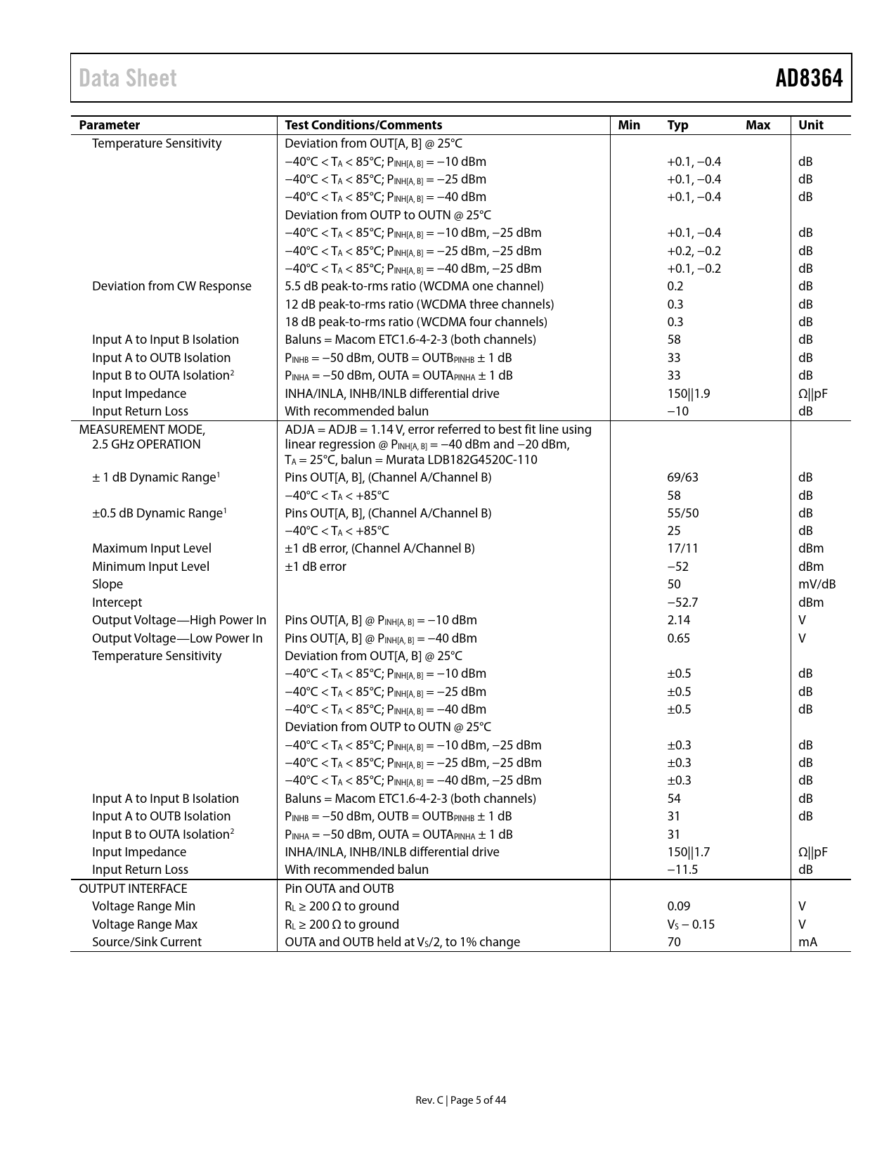 link to page 7 link to page 7 link to page 7 link to page 7 Data SheetAD8364ParameterTest Conditions/CommentsMinTypMaxUnit Temperature Sensitivity Deviation from OUT[A, B] @ 25°C −40°C < TA < 85°C; PINH[A, B] = −10 dBm +0.1, −0.4 dB −40°C < TA < 85°C; PINH[A, B] = −25 dBm +0.1, −0.4 dB −40°C < TA < 85°C; PINH[A, B] = −40 dBm +0.1, −0.4 dB Deviation from OUTP to OUTN @ 25°C −40°C < TA < 85°C; PINH[A, B] = −10 dBm, −25 dBm +0.1, −0.4 dB −40°C < TA < 85°C; PINH[A, B] = −25 dBm, −25 dBm +0.2, −0.2 dB −40°C < TA < 85°C; PINH[A, B] = −40 dBm, −25 dBm +0.1, −0.2 dB Deviation from CW Response 5.5 dB peak-to-rms ratio (WCDMA one channel) 0.2 dB 12 dB peak-to-rms ratio (WCDMA three channels) 0.3 dB 18 dB peak-to-rms ratio (WCDMA four channels) 0.3 dB Input A to Input B Isolation Baluns = Macom ETC1.6-4-2-3 (both channels) 58 dB Input A to OUTB Isolation PINHB = −50 dBm, OUTB = OUTBPINHB ± 1 dB 33 dB Input B to OUTA Isolation2 PINHA = −50 dBm, OUTA = OUTAPINHA ± 1 dB 33 dB Input Impedance INHA/INLA, INHB/INLB differential drive 150||1.9 Ω||pF Input Return Loss With recommended balun −10 dB MEASUREMENT MODE, ADJA = ADJB = 1.14 V, error referred to best fit line using 2.5 GHz OPERATION linear regression @ PINH[A, B] = −40 dBm and −20 dBm, TA = 25°C, balun = Murata LDB182G4520C-110 ± 1 dB Dynamic Range1 Pins OUT[A, B], (Channel A/Channel B) 69/63 dB −40°C < TA < +85°C 58 dB ±0.5 dB Dynamic Range1 Pins OUT[A, B], (Channel A/Channel B) 55/50 dB −40°C < TA < +85°C 25 dB Maximum Input Level ±1 dB error, (Channel A/Channel B) 17/11 dBm Minimum Input Level ±1 dB error −52 dBm Slope 50 mV/dB Intercept −52.7 dBm Output Voltage—High Power In Pins OUT[A, B] @ PINH[A, B] = −10 dBm 2.14 V Output Voltage—Low Power In Pins OUT[A, B] @ PINH[A, B] = −40 dBm 0.65 V Temperature Sensitivity Deviation from OUT[A, B] @ 25°C −40°C < TA < 85°C; PINH[A, B] = −10 dBm ±0.5 dB −40°C < TA < 85°C; PINH[A, B] = −25 dBm ±0.5 dB −40°C < TA < 85°C; PINH[A, B] = −40 dBm ±0.5 dB Deviation from OUTP to OUTN @ 25°C −40°C < TA < 85°C; PINH[A, B] = −10 dBm, −25 dBm ±0.3 dB −40°C < TA < 85°C; PINH[A, B] = −25 dBm, −25 dBm ±0.3 dB −40°C < TA < 85°C; PINH[A, B] = −40 dBm, −25 dBm ±0.3 dB Input A to Input B Isolation Baluns = Macom ETC1.6-4-2-3 (both channels) 54 dB Input A to OUTB Isolation PINHB = −50 dBm, OUTB = OUTBPINHB ± 1 dB 31 dB Input B to OUTA Isolation2 PINHA = −50 dBm, OUTA = OUTAPINHA ± 1 dB 31 Input Impedance INHA/INLA, INHB/INLB differential drive 150||1.7 Ω||pF Input Return Loss With recommended balun −11.5 dB OUTPUT INTERFACE Pin OUTA and OUTB Voltage Range Min RL ≥ 200 Ω to ground 0.09 V Voltage Range Max RL ≥ 200 Ω to ground VS − 0.15 V Source/Sink Current OUTA and OUTB held at VS/2, to 1% change 70 mA Rev. C | Page 5 of 44 Document Outline FEATURES APPLICATIONS FUNCTIONAL BLOCK DIAGRAM GENERAL DESCRIPTION REVISION HISTORY SPECIFICATIONS ABSOLUTE MAXIMUM RATINGS ESD CAUTION PIN CONFIGURATION AND FUNCTION DESCRIPTIONS TYPICAL PERFORMANCE CHARACTERISTICS THEORY OF OPERATION SQUARE LAW DETECTOR AND AMPLITUDE TARGET RF INPUT INTERFACE OFFSET COMPENSATION TEMPERATURE SENSOR INTERFACE VREF INTERFACE POWER-DOWN INTERFACE VST[A, B] INTERFACE OUT[A, B, P, N] OUTPUTS MEASUREMENT CHANNEL DIFFERENCE OUTPUT USING OUT[P, N] CONTROLLER MODE RF MEASUREMENT MODE BASIC CONNECTIONS CONTROLLER MODE BASIC CONNECTIONS Automatic Power Control Automatic Gain Control CONSTANT OUTPUT POWER OPERATION GAIN-STABLE TRANSMITTER/RECEIVER TEMPERATURE COMPENSATION ADJUSTMENT DEVICE CALIBRATION AND ERROR CALCULATION SELECTING CALIBRATION POINTS TO IMPROVE ACCURACY OVER A REDUCED RANGE CHANNEL ISOLATION ALTERING THE SLOPE CHOOSING THE RIGHT VALUE FOR CHP[A, B] AND CLP[A, B] RF BURST RESPONSE TIME SINGLE-ENDED INPUT OPERATION PRINTED CIRCUIT BOARD CONSIDERATIONS PACKAGE CONSIDERATIONS DESCRIPTION OF CHARACTERIZATION BASIS FOR ERROR CALCULATIONS EVALUATION BOARD OUTLINE DIMENSIONS ORDERING GUIDE