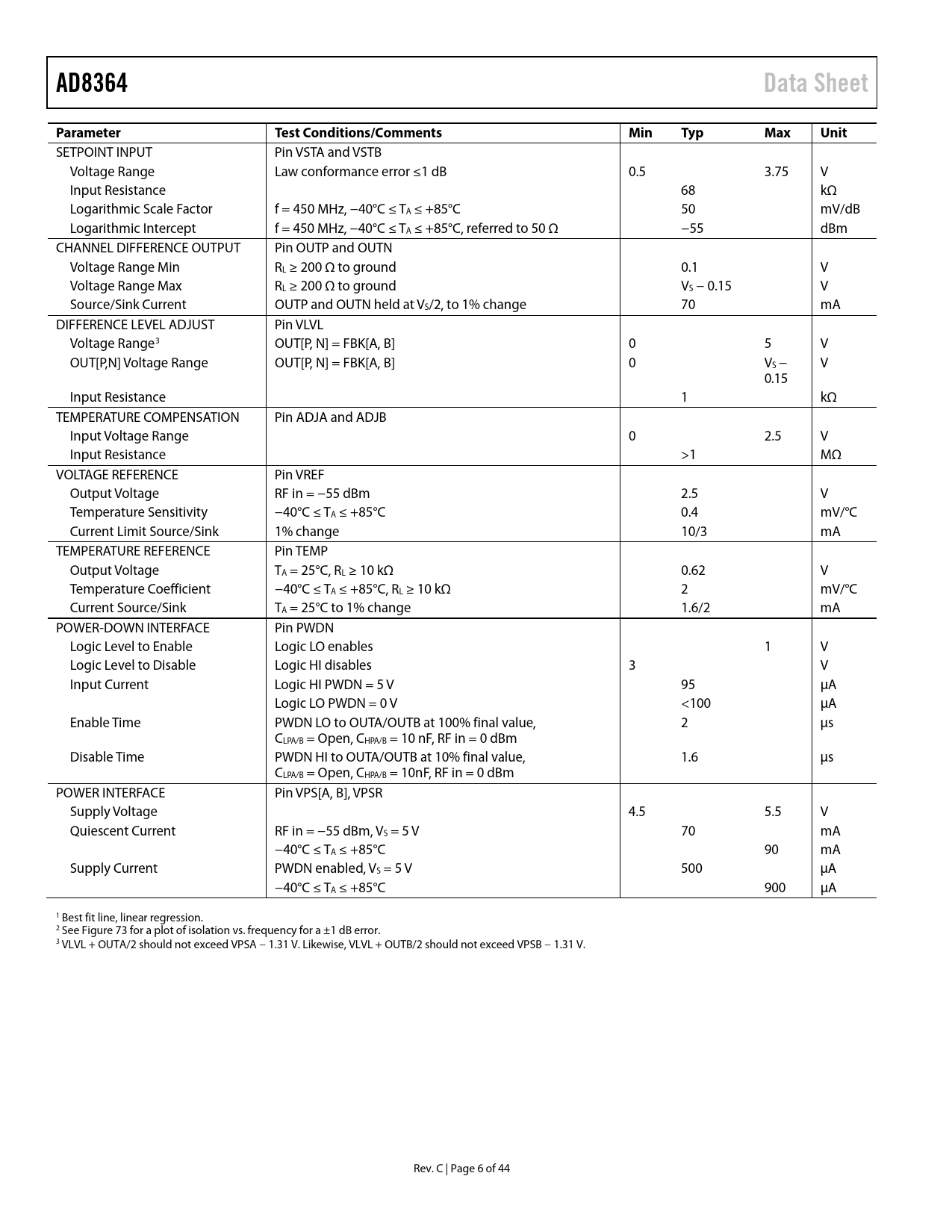 link to page 35 AD8364Data SheetParameterTest Conditions/CommentsMinTypMaxUnit SETPOINT INPUT Pin VSTA and VSTB Voltage Range Law conformance error ≤1 dB 0.5 3.75 V Input Resistance 68 kΩ Logarithmic Scale Factor f = 450 MHz, −40°C ≤ TA ≤ +85°C 50 mV/dB Logarithmic Intercept f = 450 MHz, −40°C ≤ TA ≤ +85°C, referred to 50 Ω −55 dBm CHANNEL DIFFERENCE OUTPUT Pin OUTP and OUTN Voltage Range Min RL ≥ 200 Ω to ground 0.1 V Voltage Range Max RL ≥ 200 Ω to ground VS − 0.15 V Source/Sink Current OUTP and OUTN held at VS/2, to 1% change 70 mA DIFFERENCE LEVEL ADJUST Pin VLVL Voltage Range3 OUT[P, N] = FBK[A, B] 0 5 V OUT[P,N] Voltage Range OUT[P, N] = FBK[A, B] 0 VS − V 0.15 Input Resistance 1 kΩ TEMPERATURE COMPENSATION Pin ADJA and ADJB Input Voltage Range 0 2.5 V Input Resistance >1 MΩ VOLTAGE REFERENCE Pin VREF Output Voltage RF in = −55 dBm 2.5 V Temperature Sensitivity −40°C ≤ TA ≤ +85°C 0.4 mV/°C Current Limit Source/Sink 1% change 10/3 mA TEMPERATURE REFERENCE Pin TEMP Output Voltage TA = 25°C, RL ≥ 10 kΩ 0.62 V Temperature Coefficient −40°C ≤ TA ≤ +85°C, RL ≥ 10 kΩ 2 mV/°C Current Source/Sink TA = 25°C to 1% change 1.6/2 mA POWER-DOWN INTERFACE Pin PWDN Logic Level to Enable Logic LO enables 1 V Logic Level to Disable Logic HI disables 3 V Input Current Logic HI PWDN = 5 V 95 µA Logic LO PWDN = 0 V <100 µA Enable Time PWDN LO to OUTA/OUTB at 100% final value, 2 µs CLPA/B = Open, CHPA/B = 10 nF, RF in = 0 dBm Disable Time PWDN HI to OUTA/OUTB at 10% final value, 1.6 µs CLPA/B = Open, CHPA/B = 10nF, RF in = 0 dBm POWER INTERFACE Pin VPS[A, B], VPSR Supply Voltage 4.5 5.5 V Quiescent Current RF in = −55 dBm, VS = 5 V 70 mA −40°C ≤ TA ≤ +85°C 90 mA Supply Current PWDN enabled, VS = 5 V 500 µA −40°C ≤ TA ≤ +85°C 900 µA 1 Best fit line, linear regression. 2 See Figure 73 for a plot of isolation vs. frequency for a ±1 dB error. 3 VLVL + OUTA/2 should not exceed VPSA − 1.31 V. Likewise, VLVL + OUTB/2 should not exceed VPSB − 1.31 V. Rev. C | Page 6 of 44 Document Outline FEATURES APPLICATIONS FUNCTIONAL BLOCK DIAGRAM GENERAL DESCRIPTION REVISION HISTORY SPECIFICATIONS ABSOLUTE MAXIMUM RATINGS ESD CAUTION PIN CONFIGURATION AND FUNCTION DESCRIPTIONS TYPICAL PERFORMANCE CHARACTERISTICS THEORY OF OPERATION SQUARE LAW DETECTOR AND AMPLITUDE TARGET RF INPUT INTERFACE OFFSET COMPENSATION TEMPERATURE SENSOR INTERFACE VREF INTERFACE POWER-DOWN INTERFACE VST[A, B] INTERFACE OUT[A, B, P, N] OUTPUTS MEASUREMENT CHANNEL DIFFERENCE OUTPUT USING OUT[P, N] CONTROLLER MODE RF MEASUREMENT MODE BASIC CONNECTIONS CONTROLLER MODE BASIC CONNECTIONS Automatic Power Control Automatic Gain Control CONSTANT OUTPUT POWER OPERATION GAIN-STABLE TRANSMITTER/RECEIVER TEMPERATURE COMPENSATION ADJUSTMENT DEVICE CALIBRATION AND ERROR CALCULATION SELECTING CALIBRATION POINTS TO IMPROVE ACCURACY OVER A REDUCED RANGE CHANNEL ISOLATION ALTERING THE SLOPE CHOOSING THE RIGHT VALUE FOR CHP[A, B] AND CLP[A, B] RF BURST RESPONSE TIME SINGLE-ENDED INPUT OPERATION PRINTED CIRCUIT BOARD CONSIDERATIONS PACKAGE CONSIDERATIONS DESCRIPTION OF CHARACTERIZATION BASIS FOR ERROR CALCULATIONS EVALUATION BOARD OUTLINE DIMENSIONS ORDERING GUIDE