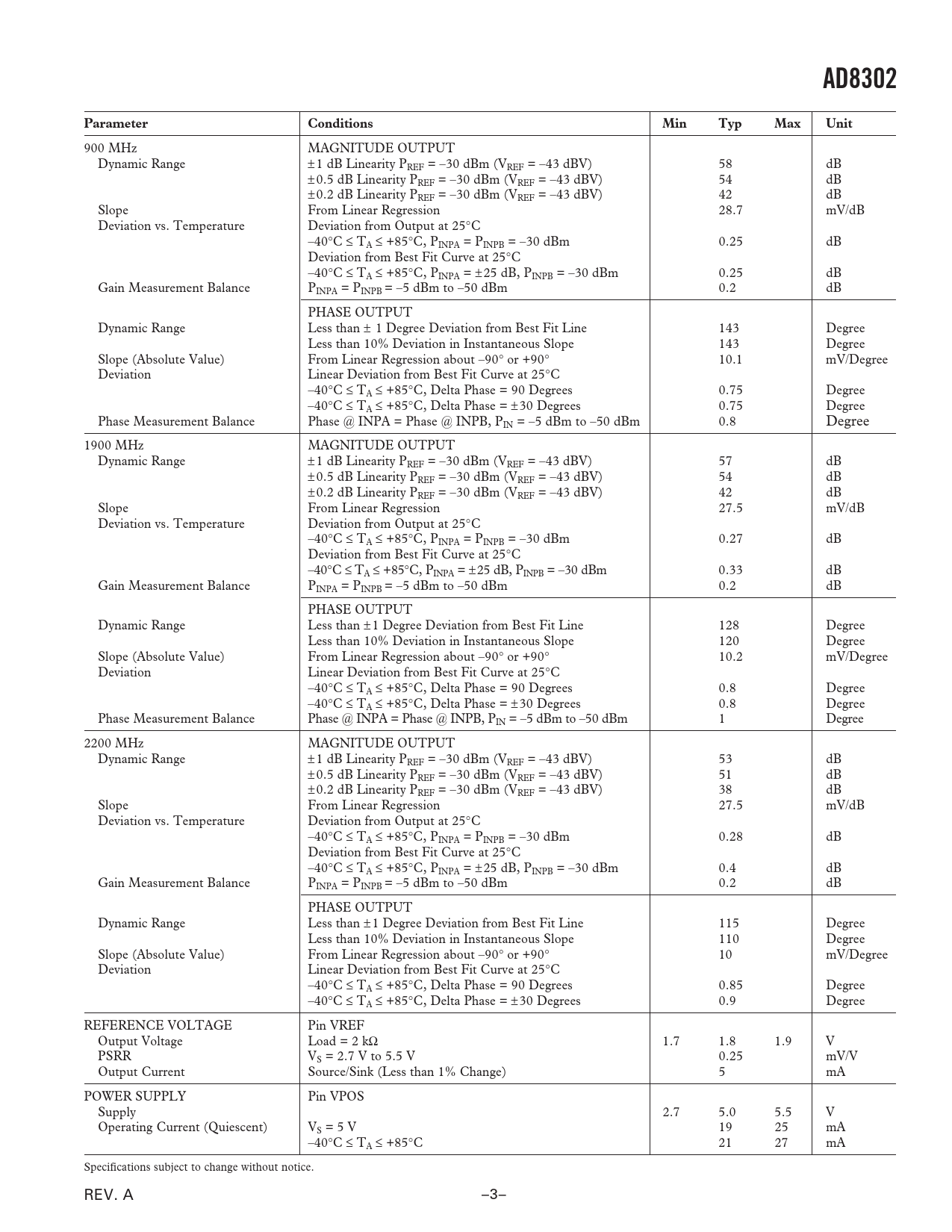 AD8302 Parameter Conditions Min Typ Max Unit