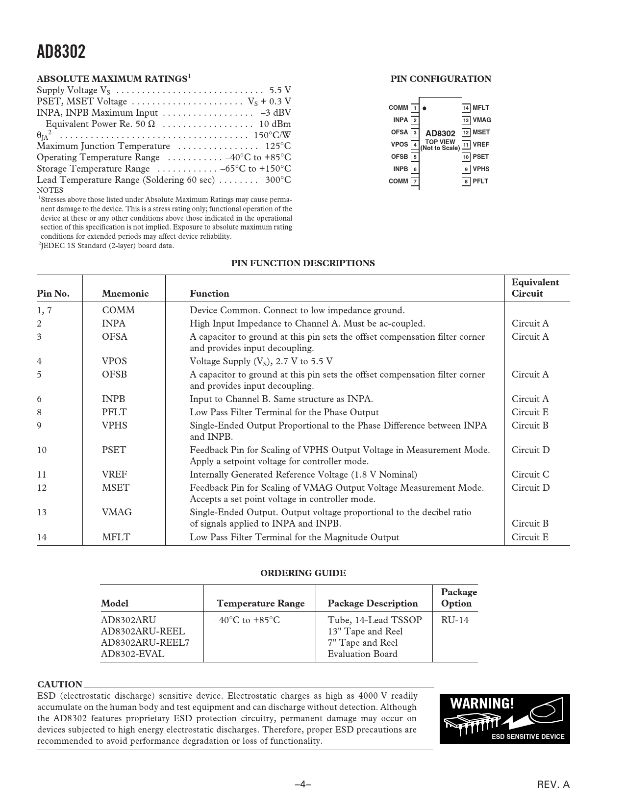AD8302. ABSOLUTE MAXIMUM RATINGS1. PIN CONFIGURATION. COMM 1. 14 MFLT. INPA 2. 13 VMAG. OFSA 3. 12 MSET. TOP VIEW. VPOS 4. 11 VREF