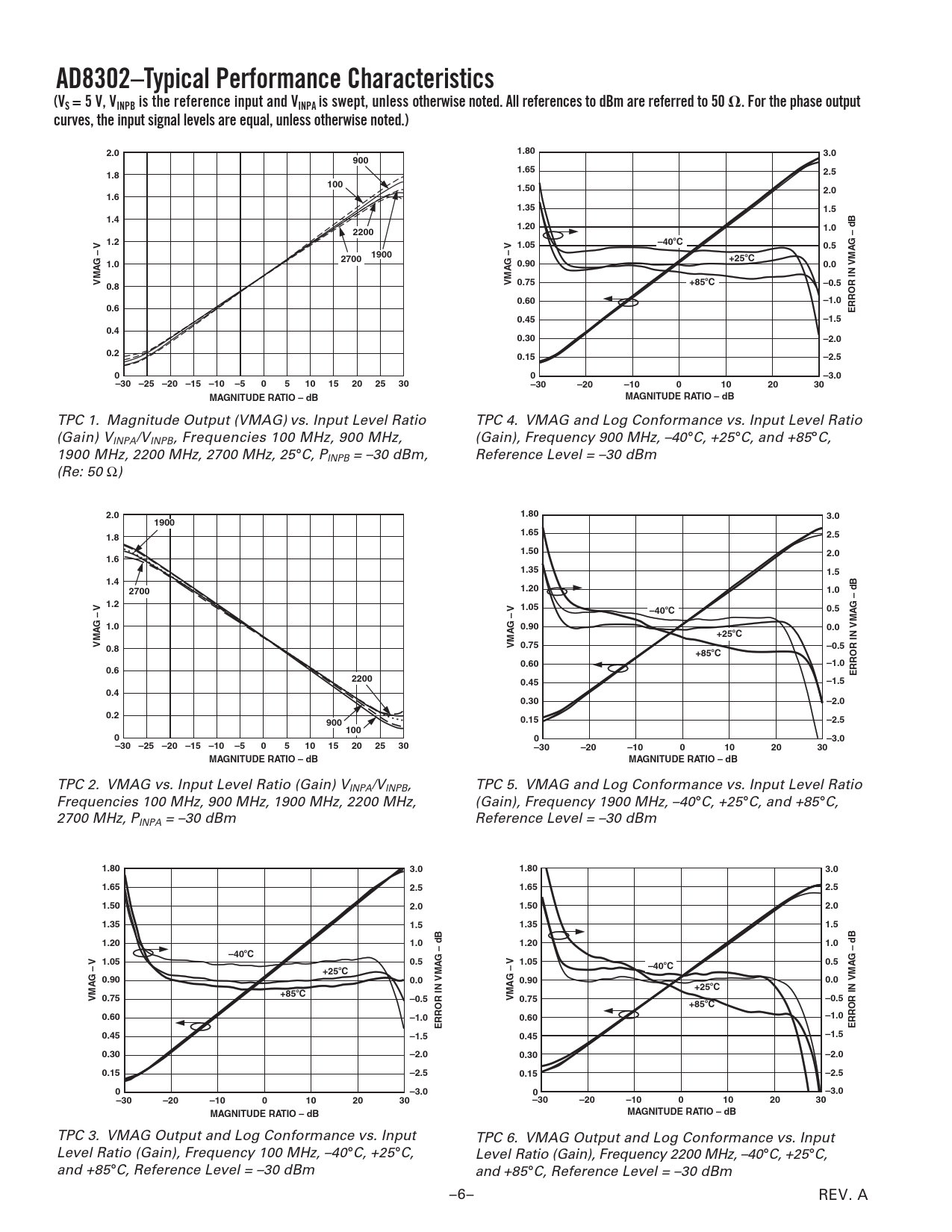 AD8302–Typical Performance Characteristics(VS = 5 V, VINPB is the reference input and VINPA is swept, unless otherwise noted. All references to dBm are referred to 50 ⍀ . For the phase output curves, the input signal levels are equal, unless otherwise noted.)2.01.803.09001.651.82.51001.502.01.61.351.51.41.201.0dB2200–1.2–40 ⴗ CGVV 1.050.5–1900–G2700+25 ⴗ C1.0G 0.900.0VMA 0.8VMA 0.75+85 ⴗ C–0.5OR IN VMA0.60–1.00.6ERR0.45–1.50.40.30–2.00.20.15–2.500–3.0–30 –25 –20 –15 –10–5051015202530–30–20–100102030MAGNITUDE RATIO – dBMAGNITUDE RATIO – dB TPC 1. Magnitude Output (VMAG) vs. Input Level Ratio TPC 4. VMAG and Log Conformance vs. Input Level Ratio (Gain) VINPA/VINPB, Frequencies 100 MHz, 900 MHz, (Gain), Frequency 900 MHz, –40 ⴗC, +25ⴗC, and +85ⴗC, 1900 MHz, 2200 MHz, 2700 MHz, 25 ⴗC, PINPB = –30 dBm, Reference Level = –30 dBm (Re: 50 Ω) 2.01.803.019001.651.82.51.502.01.61.351.51.427001.201.0dB –1.2GV1.050.5–V–40 ⴗ C–G 1.0G 0.900.0+25 ⴗ CVMA 0.8VMA 0.75–0.5+85 ⴗ COR IN VMA0.60–1.00.6ERR22000.45–1.50.40.30–2.00.29000.15–2.510000–3.0–30 –25 –20 –15 –10–5051015202530–30–20–100102030MAGNITUDE RATIO – dBMAGNITUDE RATIO – dB TPC 2. VMAG vs. Input Level Ratio (Gain) VINPA/VINPB, TPC 5. VMAG and Log Conformance vs. Input Level Ratio Frequencies 100 MHz, 900 MHz, 1900 MHz, 2200 MHz, (Gain), Frequency 1900 MHz, –40ⴗC, +25ⴗC, and +85ⴗC, 2700 MHz, PINPA = –30 dBm Reference Level = –30 dBm 1.803.01.803.01.652.51.652.51.502.01.502.01.351.51.351.51.201.0dB1.201.0dB–––40 ⴗ CGGV 1.050.5V 1.050.5––40 ⴗ C+25 ⴗ C–G 0.900.0G 0.900.0+25 ⴗ CVMA+85 ⴗ C0.75–0.5VMA 0.75–0.5OR IN VMA+85 ⴗ COR IN VMA0.60–1.0–1.00.60ERRERR0.45–1.5–1.50.450.30–2.00.30–2.00.15–2.50.15–2.50–3.00–3.0–30–20–100102030–30–20–100102030MAGNITUDE RATIO – dBMAGNITUDE RATIO – dB TPC 3. VMAG Output and Log Conformance vs. Input TPC 6. VMAG Output and Log Conformance vs. Input Level Ratio (Gain), Frequency 100 MHz, –40ⴗC, +25ⴗC, Level Ratio (Gain), Frequency 2200 MHz, –40ⴗC, +25ⴗC, and +85ⴗC, Reference Level = –30 dBm and +85ⴗC, Reference Level = –30 dBm –6– REV. A Document Outline FEATURES PRODUCT DESCRIPTION FUNCTIONAL BLOCK DIAGRAM SPECIFICATIONS ABSOLUTE MAXIMUM RATINGS PIN CONFIGURATION PIN FUNCTION DESCRIPTIONS ORDERING GUIDE CAUTION Equivalent Circuits Typical Performance Characteristics GENERAL DESCRIPTION AND THEORY Basic Theory Structure BASIC CONNECTIONS Measurement Mode Interfacing to the Input Channels Dynamic Range Cross Modulation of Magnitude and Phase Modifying the Slope and Center Point Comparator and Controller Modes APPLICATIONS Measuring Amplifier Gain and Compression CHARACTERIZATION SETUPS AND METHODS Gain Phase OUTLINE DIMENSIONS