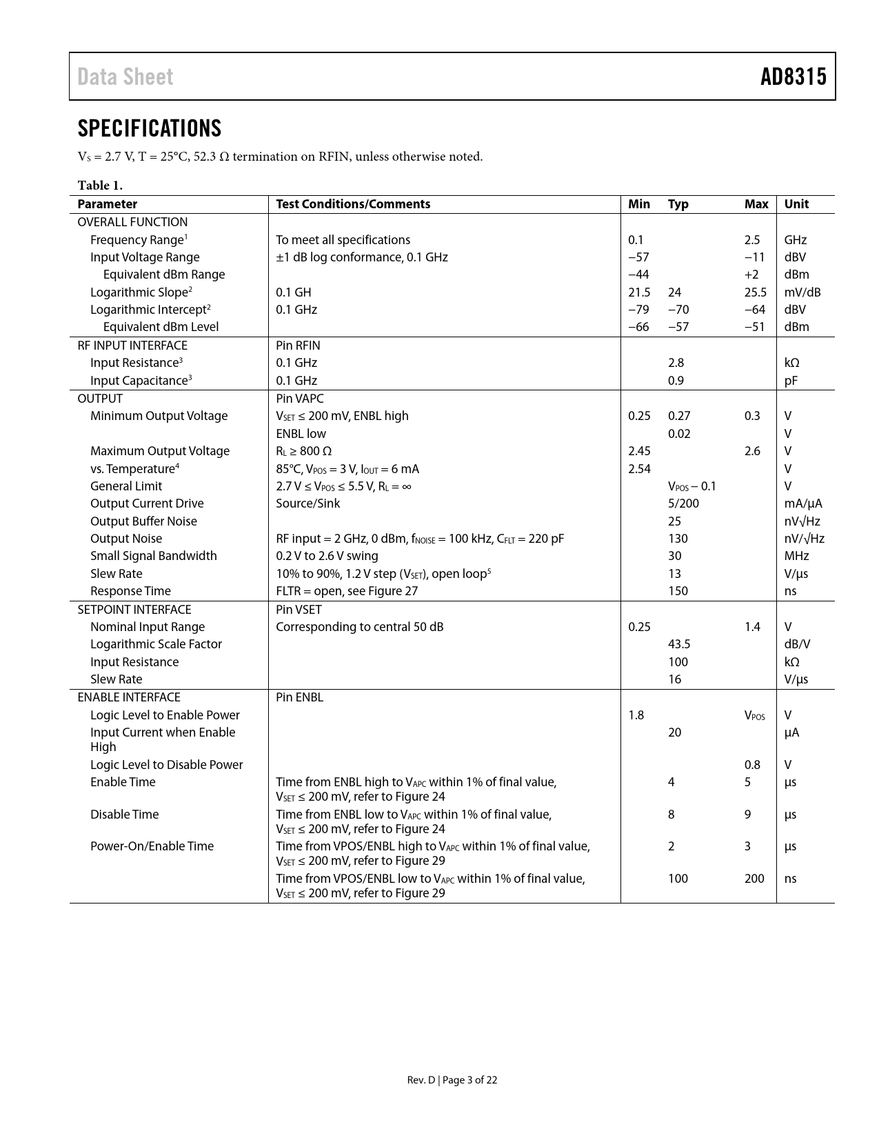 Data Sheet. AD8315. SPECIFICATIONS. Table 1. Parameter Test. Conditions/Comments. Min. Typ. Max. Unit