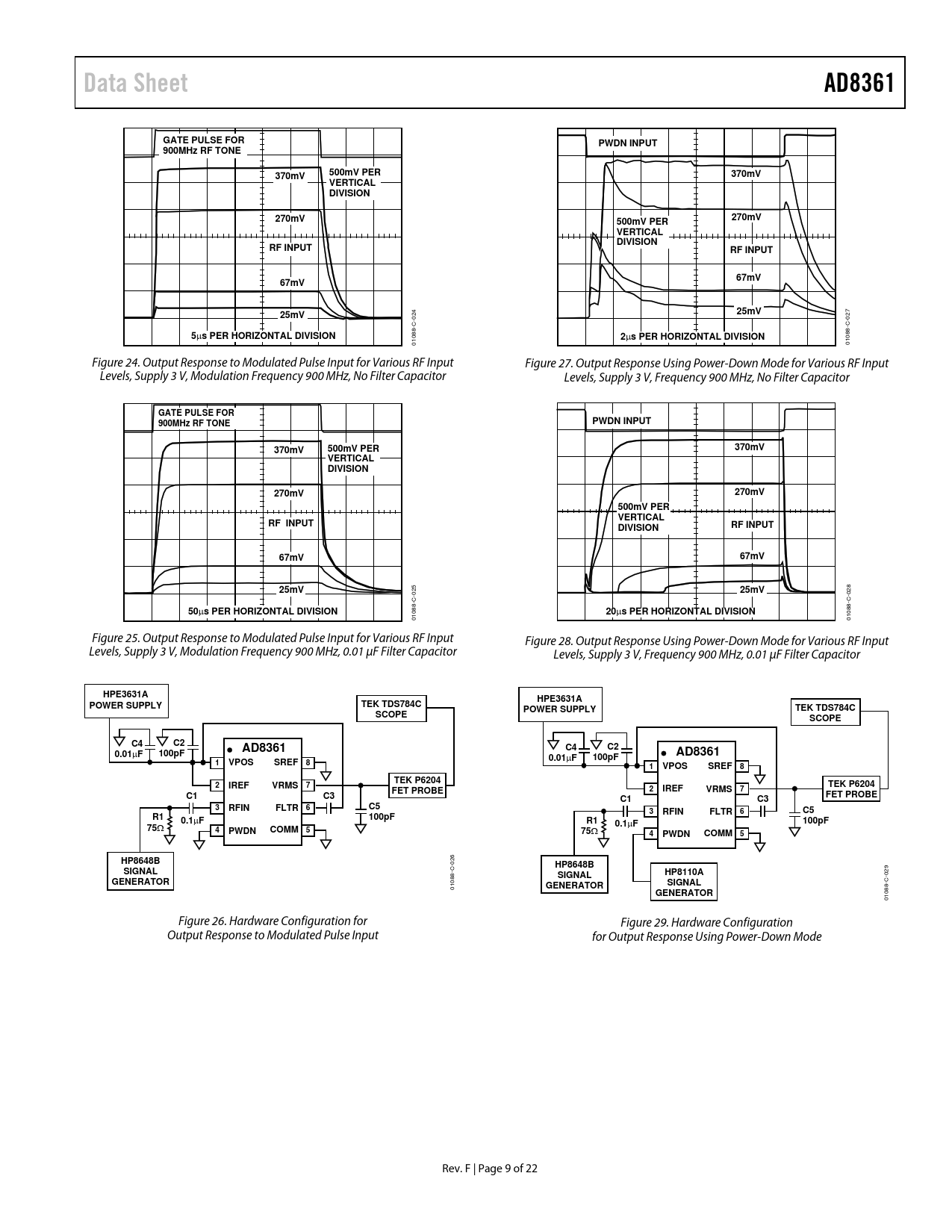 Data Sheet AD8361 GATE PULSE FOR PWDN INPUT 900MHz RF TONE 370mV 500mV PER 370mV VERTICAL DIVISION 270mV 270mV 500mV PER VERTICAL DIVISION RF INPUT RF INPUT 67mV 67mV 25mV 25mV 5