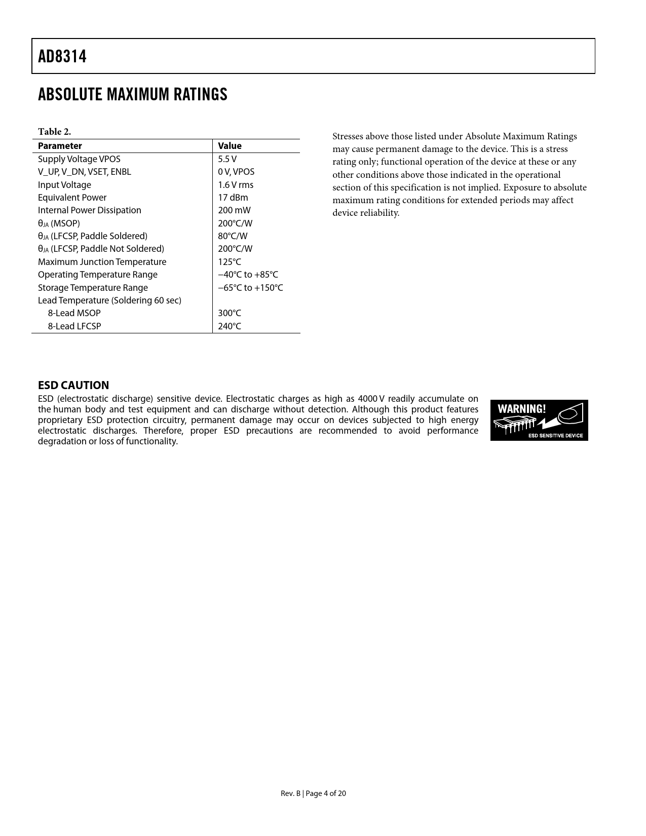 AD8314 ABSOLUTE MAXIMUM RATINGS Table 2 Parameter Value ESD CAUTION