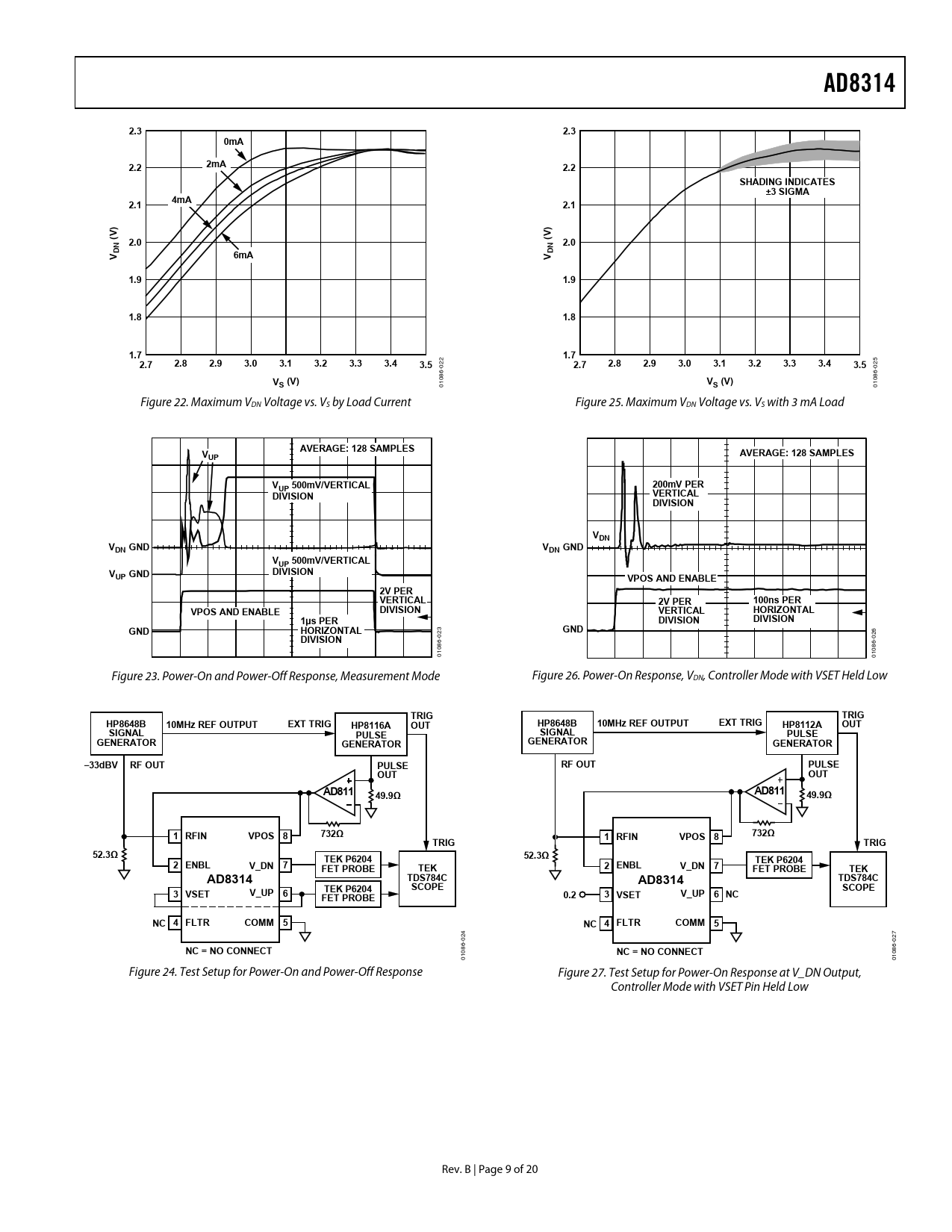 AD83142.32.30mA2.22mA2.2SHADING INDICATES±3 SIGMA2.14mA2.1))(V2.0(V2.0DNDNV6mAV1.91.91.81.81.71.72.72.82.93.03.13.23.33.43.5 22 25 0 2.72.82.93.03.13.23.33.43.5 0 6- 6- V 08 08 S (V)V 01 S (V) 01 Figure 22. Maximum VDN Voltage vs. VS by Load Current Figure 25. Maximum VDN Voltage vs. VS with 3 mA Load AVERAGE: 128 SAMPLESVAVERAGE: 128 SAMPLESUPVUP 500mV/VERTICAL200mV PERDIVISIONVERTICALDIVISIONVDNVDN GNDVDN GNDVUP 500mV/VERTICALVDIVISIONUP GNDVPOS AND ENABLE2V PERVERTICAL2V PER100ns PERVPOS AND ENABLEDIVISIONVERTICALHORIZONTAL1µs PERDIVISIONDIVISIONGNDHORIZONTAL 23 GND 26 DIVISION 0 0 6- 6- 08 08 01 01 Figure 23. Power-On and Power-Off Response, Measurement Mode Figure 26. Power-On Response, VDN, Controller Mode with VSET Held Low TRIGTRIGHP8648B10MHz REF OUTPUTEXT TRIGHP8116AOUTHP8648B10MHz REF OUTPUTEXT TRIGHP8112AOUTSIGNALPULSESIGNALPULSEGENERATORGENERATORGENERATORGENERATOR–33dBVRF OUTPULSERF OUTPULSEOUTOUTAD811AD81149.9Ω49.9Ω1 RFINVPOS 8732Ω1 RFINVPOS 8732ΩTRIGTRIG52.3ΩTEK P620452.3ΩTEK P62042 ENBLV_DN 7FET PROBETEK2 ENBLV_DN 7FET PROBETEKAD8314TDS784CAD8314TDS784CTEK P6204SCOPESCOPE3 VSETV_UP 6FET PROBE0.23 VSETV_UP 6 NCNC 4 FLTRCOMM 5NC 4 FLTRCOMM 5 24 27 0 0 6- 6- NC = NO CONNECT 08 NC = NO CONNECT 08 01 01 Figure 24. Test Setup for Power-On and Power-Off Response Figure 27. Test Setup for Power-On Response at V_DN Output, Controller Mode with VSET Pin Held Low Rev. B | Page 9 of 20 Document Outline FEATURES APPLICATIONS GENERAL DESCRIPTION FUNCTIONAL BLOCK DIAGRAM TABLE OF CONTENTS REVISION HISTORY SPECIFICATIONS ABSOLUTE MAXIMUM RATINGS ESD CAUTION PIN CONFIGURATIONS AND FUNCTION DESCRIPTIONS TYPICAL PERFORMANCE CHARACTERISTICS THEORY OF OPERATION INVERTED OUTPUT APPLICATIONS BASIC CONNECTIONS TRANSFER FUNCTION IN TERMS OF SLOPE AND INTERCEPT dBV VS. dBm FILTER CAPACITOR OPERATING IN CONTROLLER MODE POWER-ON AND ENABLE GLITCH INPUT COUPLING OPTIONS INCREASING THE LOGARITHMIC SLOPE IN MEASUREMENT MODE EFFECT OF WAVEFORM TYPE ON INTERCEPT MOBILE HANDSET POWER CONTROL EXAMPLES OPERATION AT 2.7 GHz USING THE LFCSP PACKAGE EVALUATION BOARD OUTLINE DIMENSIONS ORDERING GUIDE