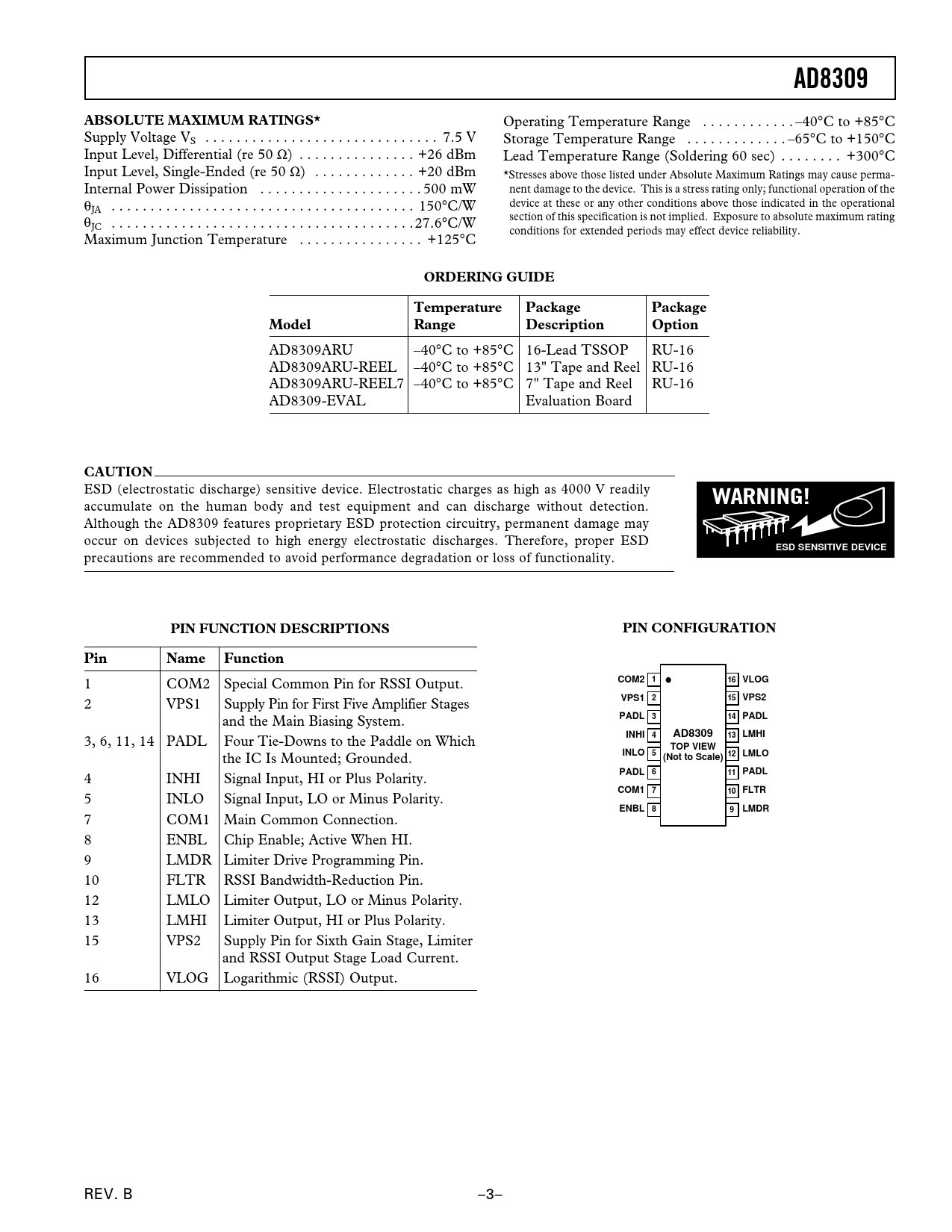accumulate on the human body and test equipment and can discharge without detection. Although the AD8309 features proprietary ESD protection circuitry, permanent damage may occur on devices subjected to high energy electrostatic discharges. Therefore, proper ESD