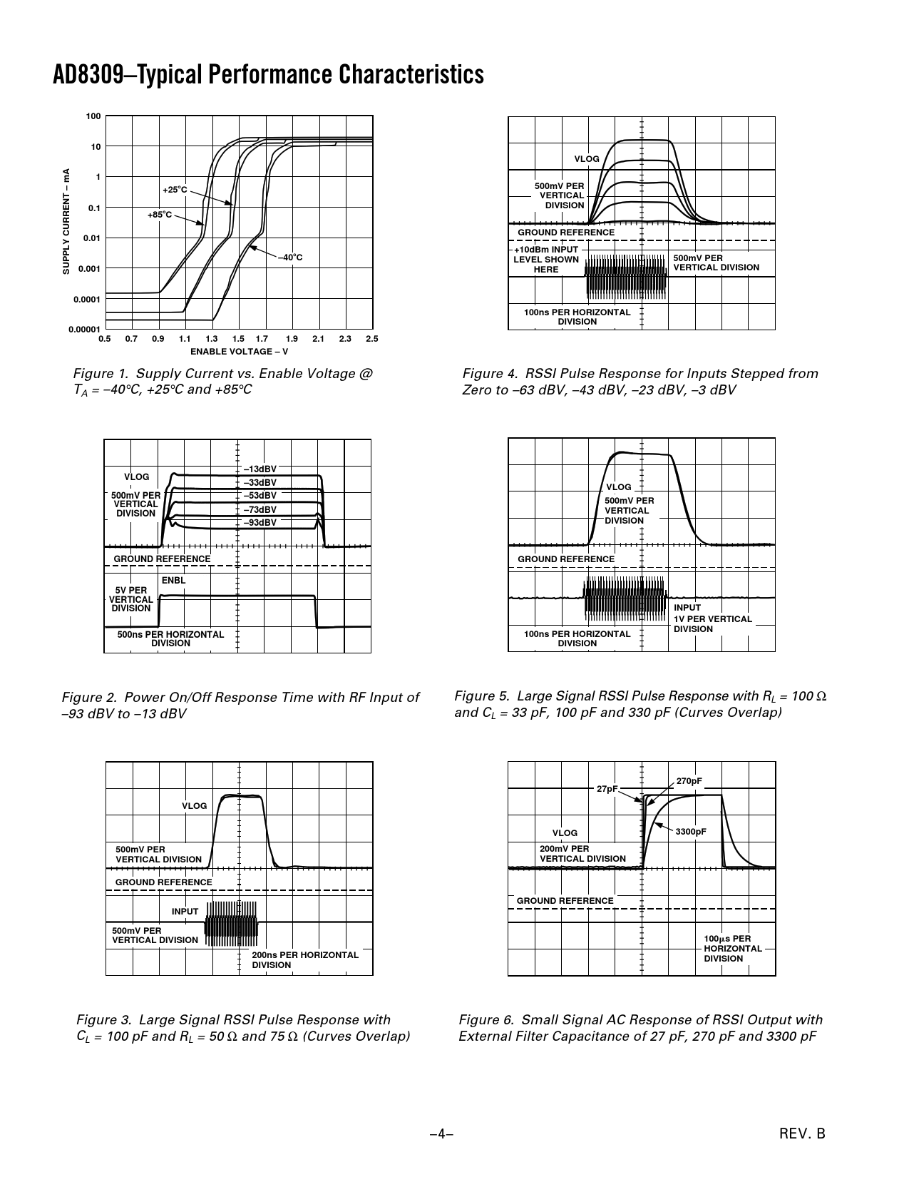 Figure 3. Large Signal RSSI Pulse Response with Figure 6. Small Signal AC Response of RSSI Output with CL = 100 pF and RL = 50 Ω and 75 Ω (Curves Overlap) External Filter Capacitance of 27 pF, 270 pF and 3300 pF –4– REV. B