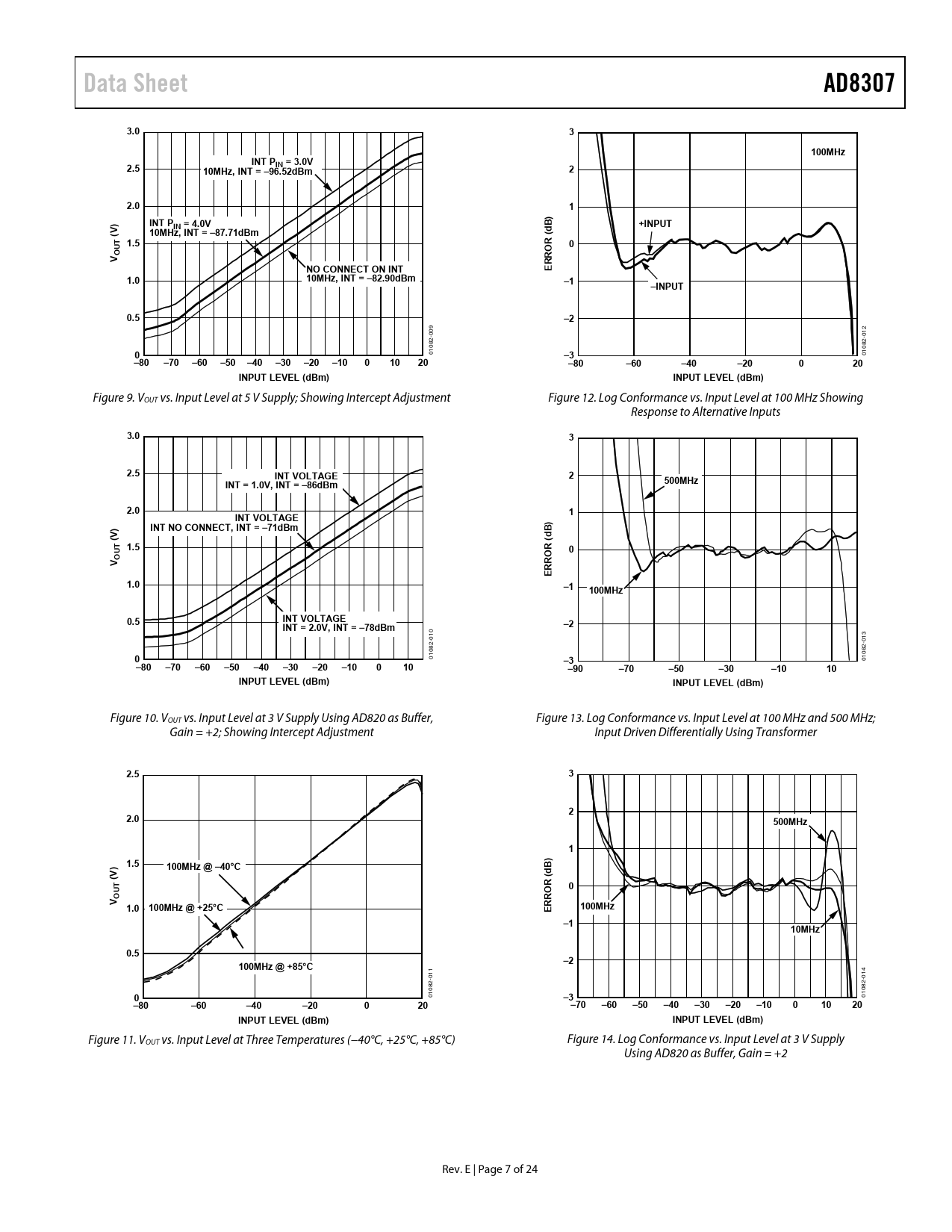 Figure 9. VOUT vs. Input Level at 5 V Supply; Showing Intercept Adjustment Figure 12. Log Conformance vs. Input Level at 100 MHz Showing Response to Alternative Inputs