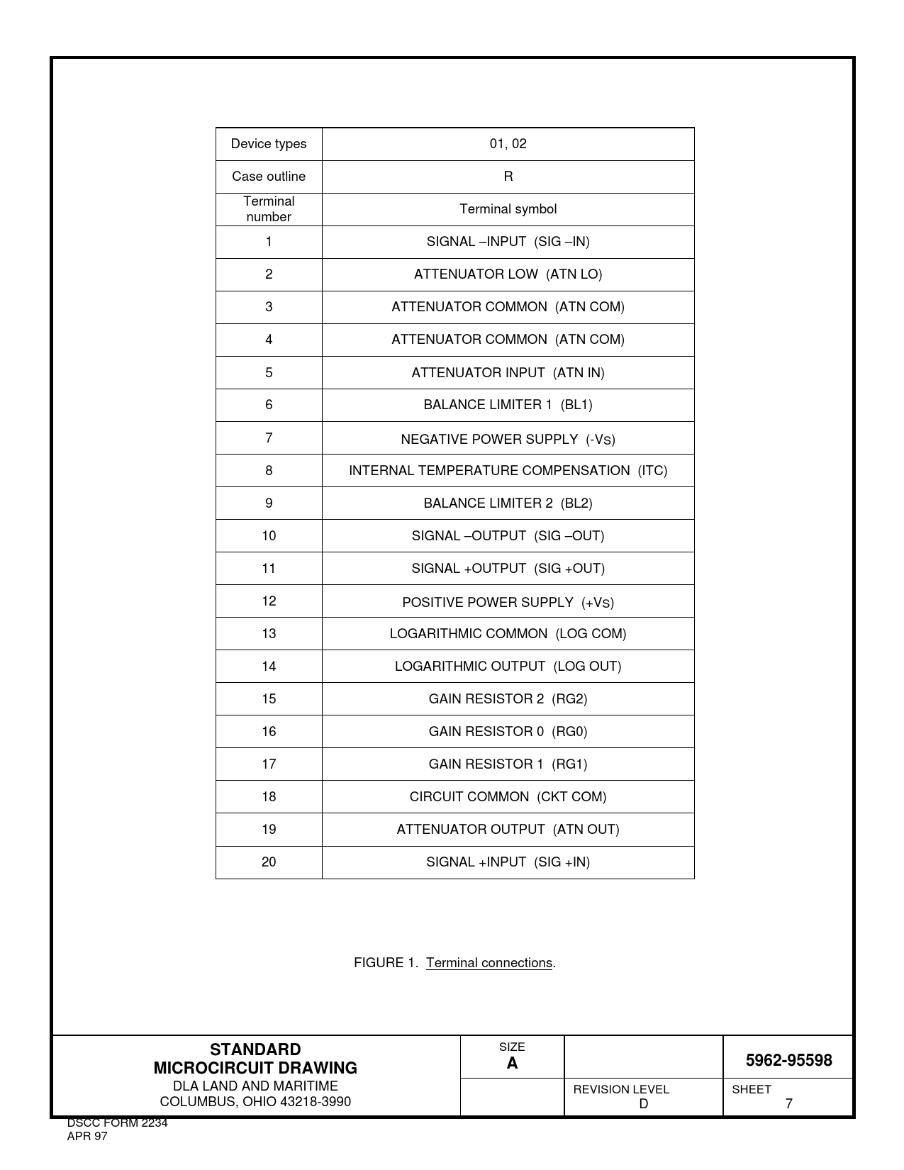Device types 01, 02 Case outline R Terminal Terminal symbol number 1 SIGNAL –INPUT (SIG –IN) 2 ATTENUATOR LOW (ATN LO) 3 ATTENUATOR COMMON (ATN COM) 4 ATTENUATOR COMMON (ATN COM) 5 ATTENUATOR INPUT (ATN IN) 6 BALANCE LIMITER 1 (BL1) 7 NEGATIVE POWER SUPPLY (-VS) 8 INTERNAL TEMPERATURE COMPENSATION (ITC) 9 BALANCE LIMITER 2 (BL2) 10 SIGNAL –OUTPUT (SIG –OUT) 11 SIGNAL +OUTPUT (SIG +OUT) 12 POSITIVE POWER SUPPLY (+VS) 13 LOGARITHMIC COMMON (LOG COM) 14 LOGARITHMIC OUTPUT (LOG OUT) 15 GAIN RESISTOR 2 (RG2) 16 GAIN RESISTOR 0 (RG0) 17 GAIN RESISTOR 1 (RG1) 18 CIRCUIT COMMON (CKT COM) 19 ATTENUATOR OUTPUT (ATN OUT) 20 SIGNAL +INPUT (SIG +IN) FIGURE 1. Terminal connections.