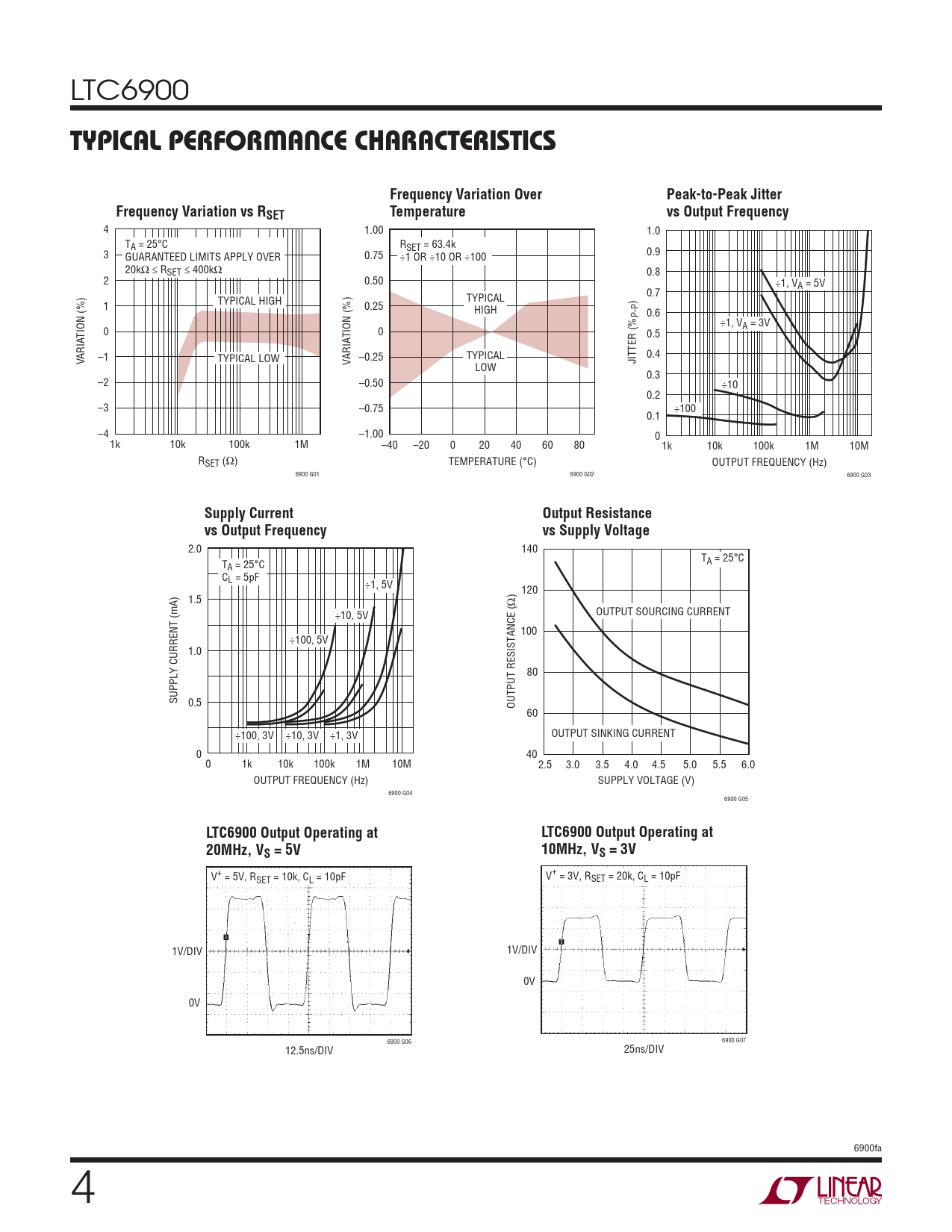 V+ = 5V, RSET = 10k, CL = 10pF V+ = 3V, RSET = 20k, CL = 10pF 1V/DIV 1V/DIV 0V 0V 6900 G06 6900 G07 12.5ns/DIV 25ns/DIV 6900fa 4