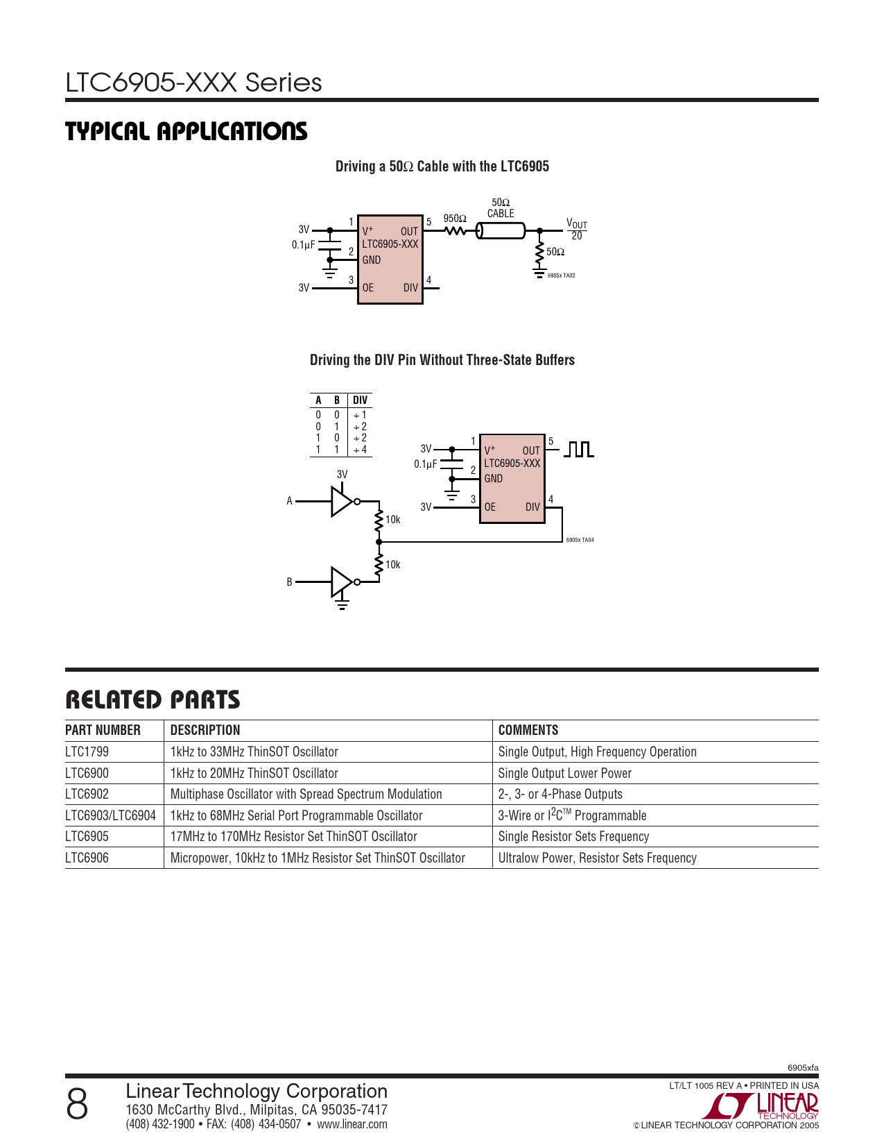 LTC1799 1kHz to 33MHz ThinSOT Oscillator Single Output, High Frequency Operation LTC6900 1kHz to 20MHz ThinSOT Oscillator Single Output Lower Power LTC6902 Multiphase Oscillator with Spread Spectrum Modulation 2-, 3- or 4-Phase Outputs LTC6903/LTC6904 1kHz to 68MHz Serial Port Programmable Oscillator 3-Wire or I2CTM Programmable LTC6905 17MHz to 170MHz Resistor Set ThinSOT Oscillator Single Resistor Sets Frequency LTC6906 Micropower, 10kHz to 1MHz Resistor Set ThinSOT Oscillator Ultralow Power, Resistor Sets Frequency 6905xfa LT/LT 1005 REV A • PRINTED IN USA 8 Linear Technology Corporation 1630 McCarthy Blvd., Milpitas, CA 95035-7417 (408) 432-1900 ● FAX: (408) 434-0507 ● www.linear.com © LINEAR TECHNOLOGY CORPORATION 2005