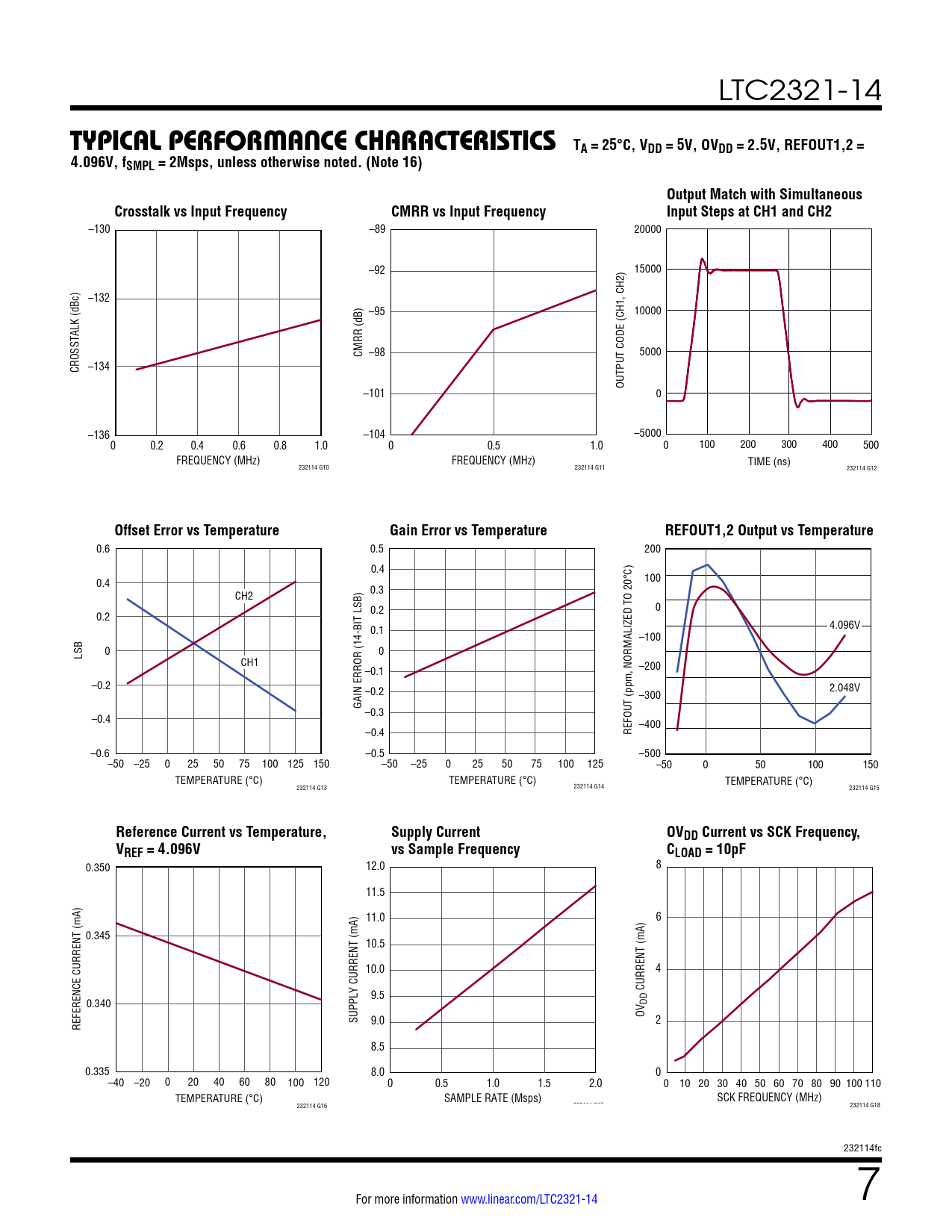 –130 –89 20000 –92 15000 –132 –95 10000 CMRR (dB) –98 5000 CROSSTALK (dBc) –134 OUTPUT CODE (CH1, CH2) –101 0 –136 –104 –5000 0 0.2 0.4 0.6 0.8 1.0 0 0.5 1.0 0 100 200 300 400 500 FREQUENCY (MHz) FREQUENCY (MHz) TIME (ns) 232114 G10 232114 G11 232114 G12