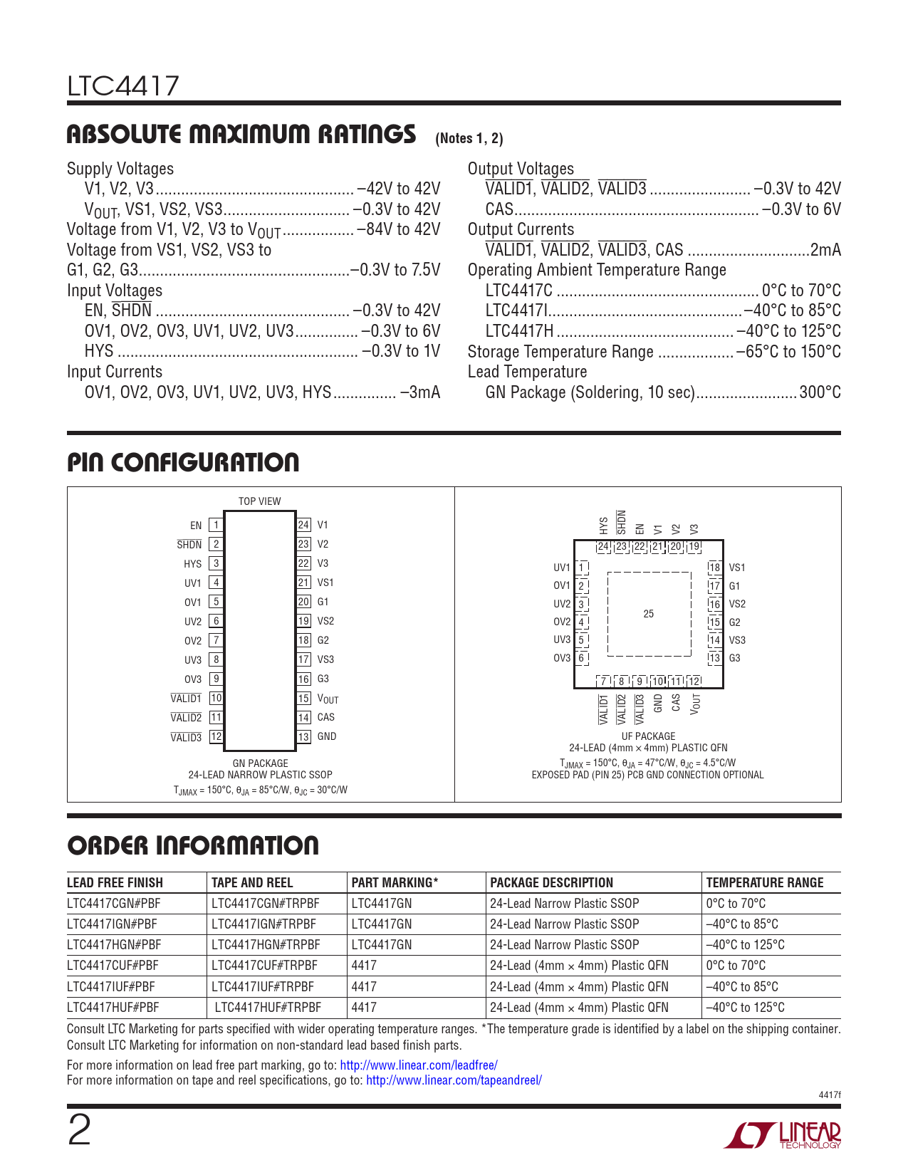 Supply Voltages Output Voltages V1, V2, V3 ... –42V to 42V VALID1, VALID2, VALID3 .. –0.3V to 42V VOUT, VS1, VS2, VS3 .. –0.3V to 42V CAS .. –0.3V to 6V Voltage from V1, V2, V3 to VOUT ... –84V to 42V Output Currents Voltage from VS1, VS2, VS3 to VALID1, VALID2, VALID3, CAS ...2mA G1, G2, G3 ..–0.3V to 7.5V Operating Ambient Temperature Range Input Voltages LTC4417C .. 0°C to 70°C EN, SHDN .. –0.3V to 42V LTC4417I..–40°C to 85°C OV1, OV2, OV3, UV1, UV2, UV3 ... –0.3V to 6V LTC4417H .. –40°C to 125°C HYS ... –0.3V to 1V Storage Temperature Range .. –65°C to 150°C Input Currents Lead Temperature OV1, OV2, OV3, UV1, UV2, UV3, HYS ... –3mA GN Package (Soldering, 10 sec) ..300°C
