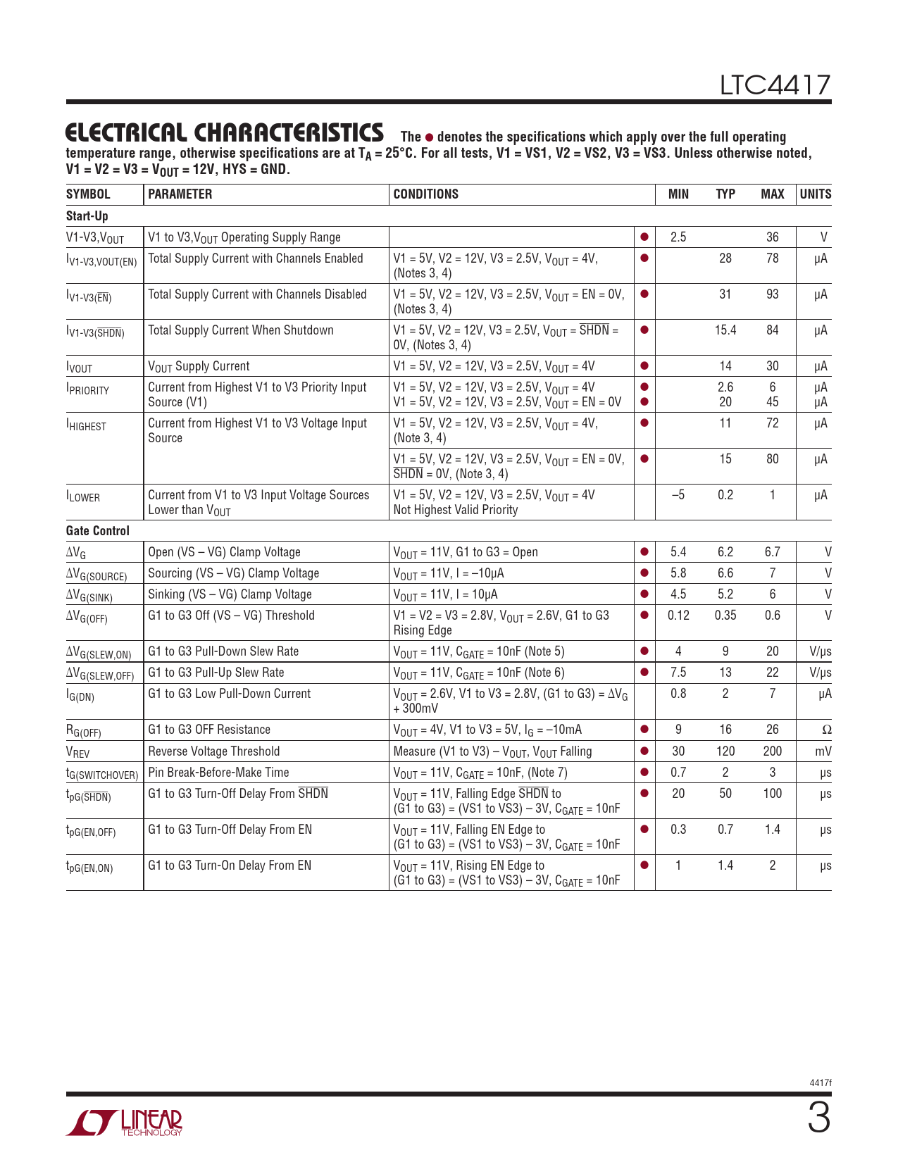 denotes the specifications which apply over the full operating temperature range, otherwise specifications are at TA = 25°C. For all tests, V1 = VS1, V2 = VS2, V3 = VS3. Unless otherwise noted, V1 = V2 = V3 = VOUT = 12V, HYS = GND. SYMBOL PARAMETER CONDITIONS MIN TYP MAX UNITS Start-Up