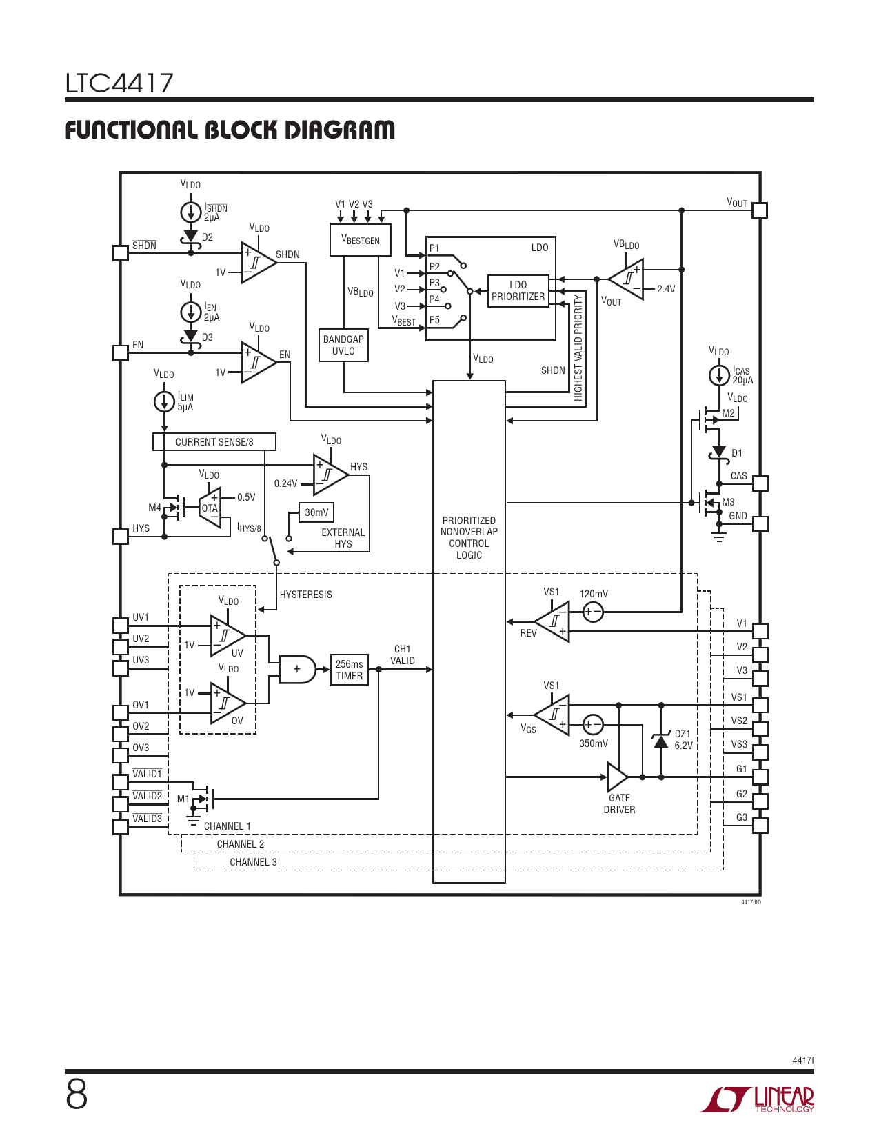 VLDO V V1 V2 V3 OUT ISHDN 2µA VLDO D2 V SHDN BESTGEN + VBLDO LDO SHDN P1 1V – + V1 P2 VLDO P3 LDO VBLDO V2 – 2.4V PRIORITIZER Y P4 VOUT IEN V3 2µA VBEST P5 VLDO D3 BANDGAP EN + UVLO EN ALID PRIORIT V V LDO LDO VLDO 1V – SHDN ICAS 20µA ILIM HIGHEST V VLDO 5µA M2 CURRENT SENSE/8 VLDO D1 + HYS VLDO CAS 0.24V – + 0.5V M3 M4 OTA– 30mV PRIORITIZED GND HYS IHYS/8 EXTERNAL NONOVERLAP HYS CONTROL LOGIC VS1 V HYSTERESIS LDO – 120mV + – UV1 + + V1 REV UV2 1V – CH1 V2 UV UV3 V VALID LDO 256ms + V3 TIMER VS1 1V + – VS1 OV1 – OV + OV2 VS2 V + – GS DZ1 350mV OV3 6.2V VS3 VALID1 G1 VALID2 M1 GATE G2 DRIVER VALID3 G3 CHANNEL 1 CHANNEL 2 CHANNEL 3 4417 BD 4417f 8 Document Outline Features Applications Description Typical Application Absolute Maximum Ratings Pin Configuration Order Information Electrical Characteristics Typical Performance Characteristics Pin Functions Functional Block Diagram Timing Diagram Operation Applications Information Typical Applications Package Description Typical Application Related Parts