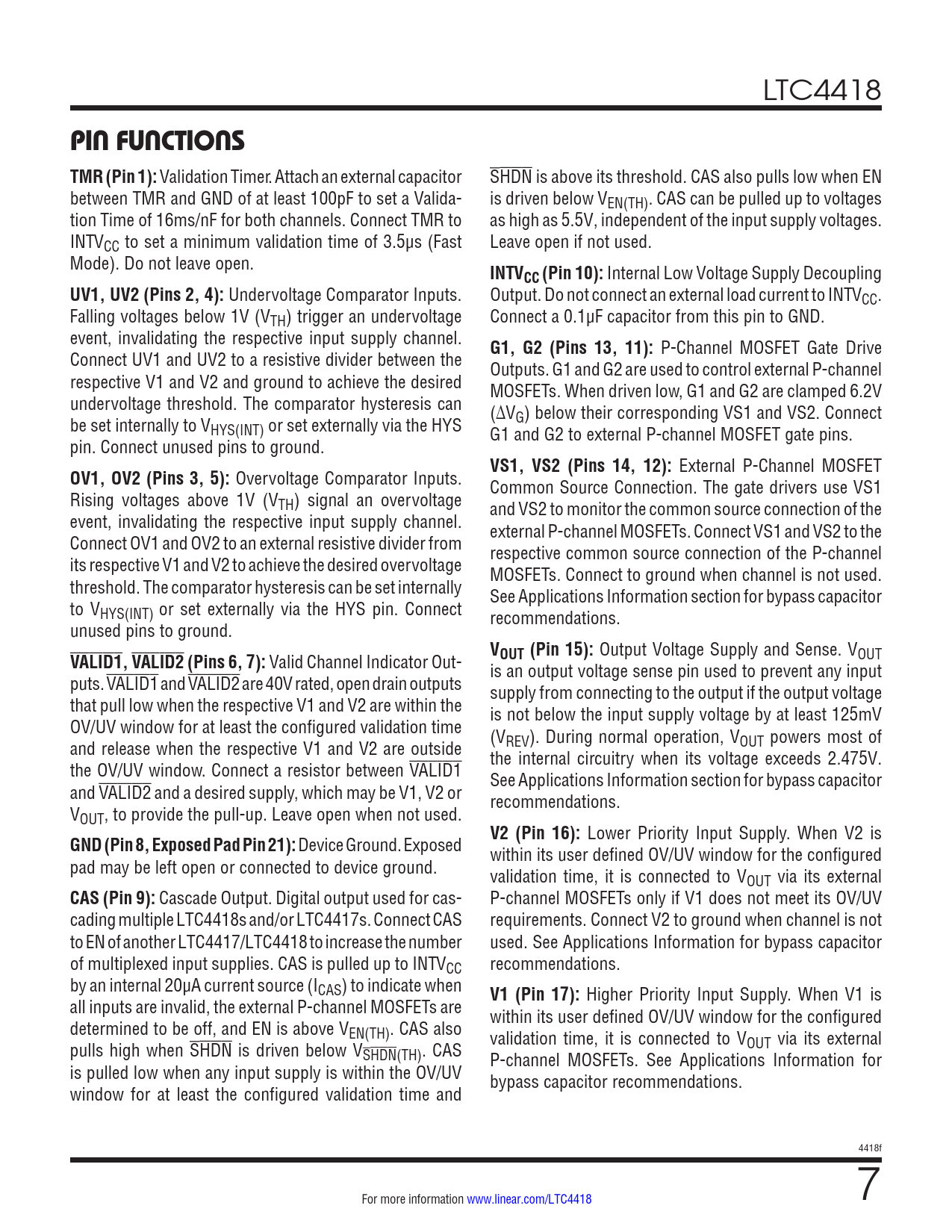 Cascade Output. Digital output used for cas- P-channel MOSFETs only if V1 does not meet its OV/UV cading multiple LTC4418s and/or LTC4417s. Connect CAS requirements. Connect V2 to ground when channel is not to EN of another LTC4417/LTC4418 to increase the number used. See Applications Information for bypass capacitor of multiplexed input supplies. CAS is pulled up to INTVCC recommendations. by an internal 20µA current source (ICAS) to indicate when