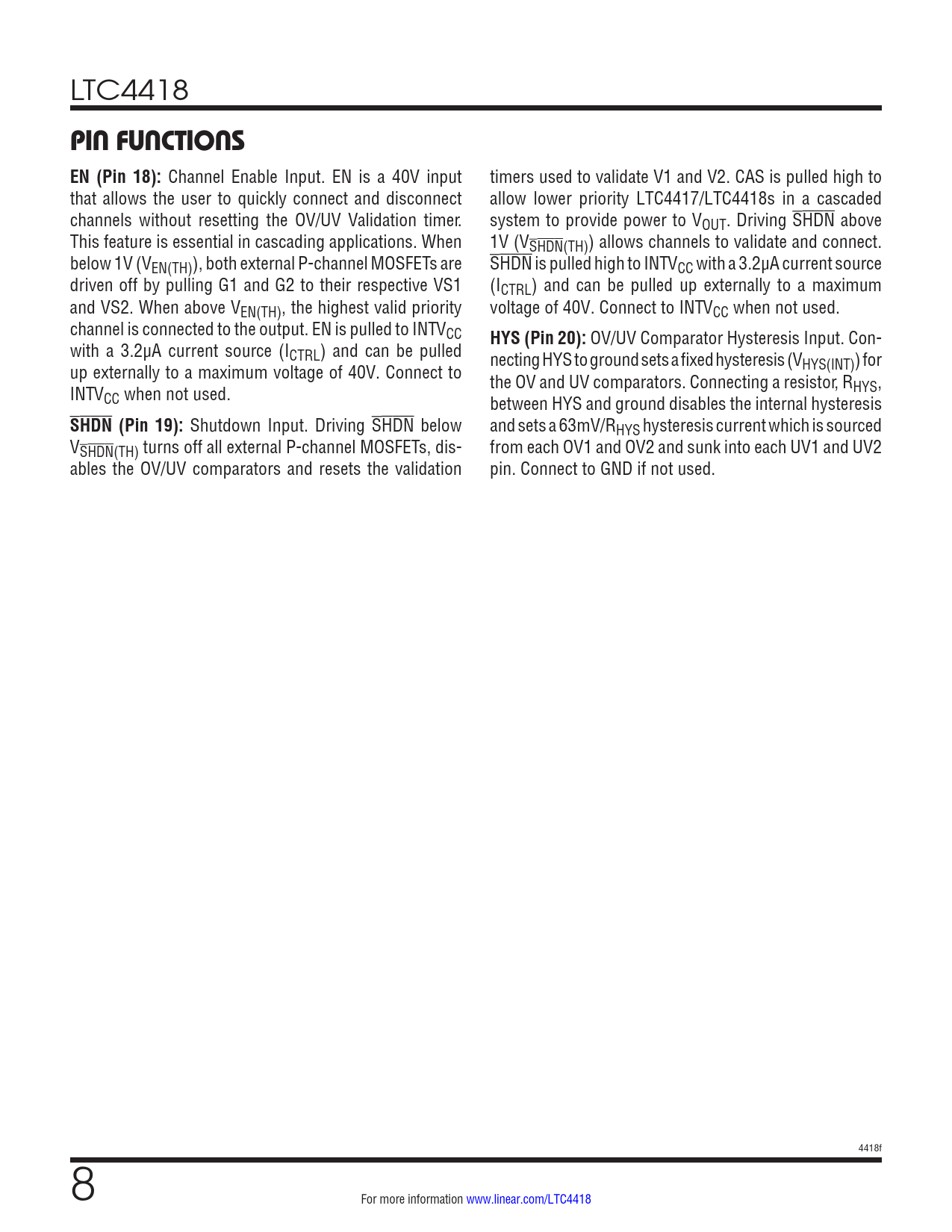 LTC4418 PIN FUNCTIONS EN (Pin 18): Channel Enable Input. EN is a 40V input timers used to validate V1 and V2. CAS is pulled high to that allows the user to quickly connect and disconnect allow lower priority LTC4417/LTC4418s in a cascaded channels without resetting the OV/UV Validation timer. system to provide power to VOUT. Driving SHDN above This feature is essential in cascading applications. When 1V (VSHDN(TH)) allows channels to validate and connect. below 1V (VEN(TH)), both external P-channel MOSFETs are SHDN is pulled high to INTVCC with a 3.2µA current source driven off by pulling G1 and G2 to their respective VS1 (ICTRL) and can be pulled up externally to a maximum and VS2. When above VEN(TH), the highest valid priority voltage of 40V. Connect to INTVCC when not used. channel is connected to the output. EN is pulled to INTVCC HYS (Pin 20): OV/UV Comparator Hysteresis Input. Con- with a 3.2µA current source (ICTRL) and can be pulled necting HYS to ground sets a fixed hysteresis (V up externally to a maximum voltage of 40V. Connect to HYS(INT)) for the OV and UV comparators. Connecting a resistor, R INTV HYS, CC when not used. between HYS and ground disables the internal hysteresis SHDN (Pin 19): Shutdown Input. Driving SHDN below and sets a 63mV/RHYS hysteresis current which is sourced VSHDN(TH) turns off all external P-channel MOSFETs, dis- from each OV1 and OV2 and sunk into each UV1 and UV2 ables the OV/UV comparators and resets the validation pin. Connect to GND if not used. 4418f 8 For more information www.linear.com/LTC4418 Document Outline Features Applications Description Typical Application Absolute Maximum Ratings Pin Configuration Order Information Electrical Characteristics Typical Performance Characteristics Pin Functions Block Diagram Timing Diagram Operation Applications Information Typical Applications Package Description Typical Application Related Parts