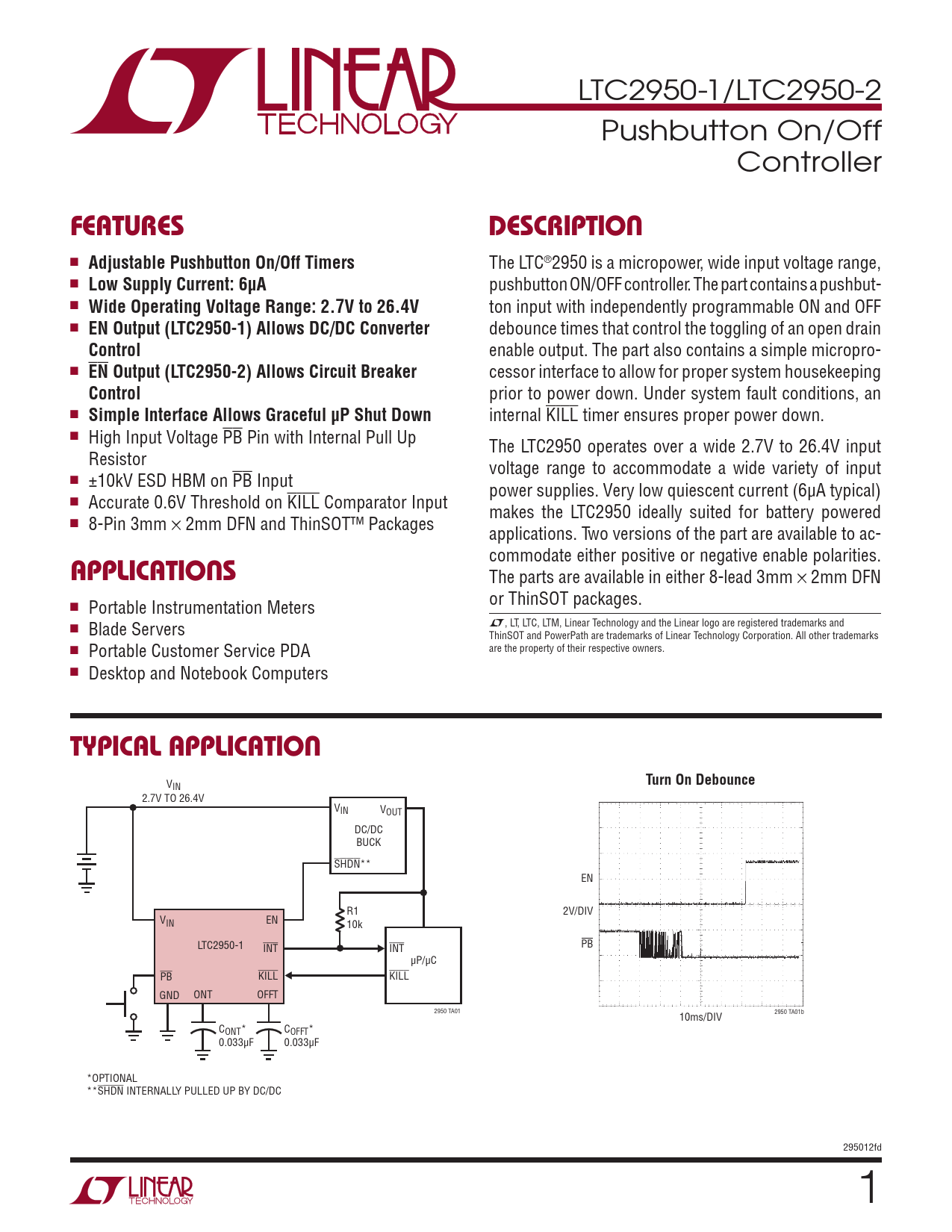 LTC2950-1/LTC2950-2 Pushbutton On/Off Controller FeaTuresDescripTion n Adjustable Pushbutton On/Off Timers The LTC®2950 is a micropower, wide input voltage range, n Low Supply Current: 6µA pushbutton ON/OFF controller. The part contains a pushbut- n Wide Operating Voltage Range: 2.7V to 26.4V ton input with independently programmable ON and OFF n EN Output (LTC2950-1) Allows DC/DC Converter debounce times that control the toggling of an open drain Control enable output. The part also contains a simple micropro- n EN Output (LTC2950-2) Allows Circuit Breaker cessor interface to allow for proper system housekeeping Control prior to power down. Under system fault conditions, an n Simple Interface Allows Graceful µP Shut Down internal KILL timer ensures proper power down. n High Input Voltage PB Pin with Internal Pull Up The LTC2950 operates over a wide 2.7V to 26.4V input Resistor voltage range to accommodate a wide variety of input n ±10kV ESD HBM on PB Input power supplies. Very low quiescent current (6µA typical) n Accurate 0.6V Threshold on KILL Comparator Input makes the LTC2950 ideally suited for battery powered n 8-Pin 3mm × 2mm DFN and ThinSOT™ Packages applications. Two versions of the part are available to ac- commodate either positive or negative enable polarities. applicaTions The parts are available in either 8-lead 3mm × 2mm DFN n or ThinSOT packages. Portable Instrumentation Meters L, LT, LTC, LTM, Linear Technology and the Linear logo are registered trademarks and n Blade Servers ThinSOT and PowerPath are trademarks of Linear Technology Corporation. All other trademarks n are the property of their respective owners. Portable Customer Service PDA n Desktop and Notebook Computers Typical applicaTion V Turn On Debounce IN 2.7V TO 26.4V VIN VOUT DC/DC BUCK SHDN** EN R1 2V/DIV VIN EN 10k LTC2950-1 PB INT INT µP/µC PB KILL KILL GND ONT OFFT 2950 TA01 10ms/DIV 2950 TA01b CONT* COFFT* 0.033µF 0.033µF *OPTIONAL **SHDN INTERNALLY PULLED UP BY DC/DC 295012fd 1 Document Outline Features Applications Description Typical Application Absolute Maximum Ratings Pin Configuration Order Information Electrical Characteristics Typical Performance Characteristics Pin Functions Block Diagram Timing Diagrams Applications Information Typical Applications Package Description Revision History Typical Application Related Parts