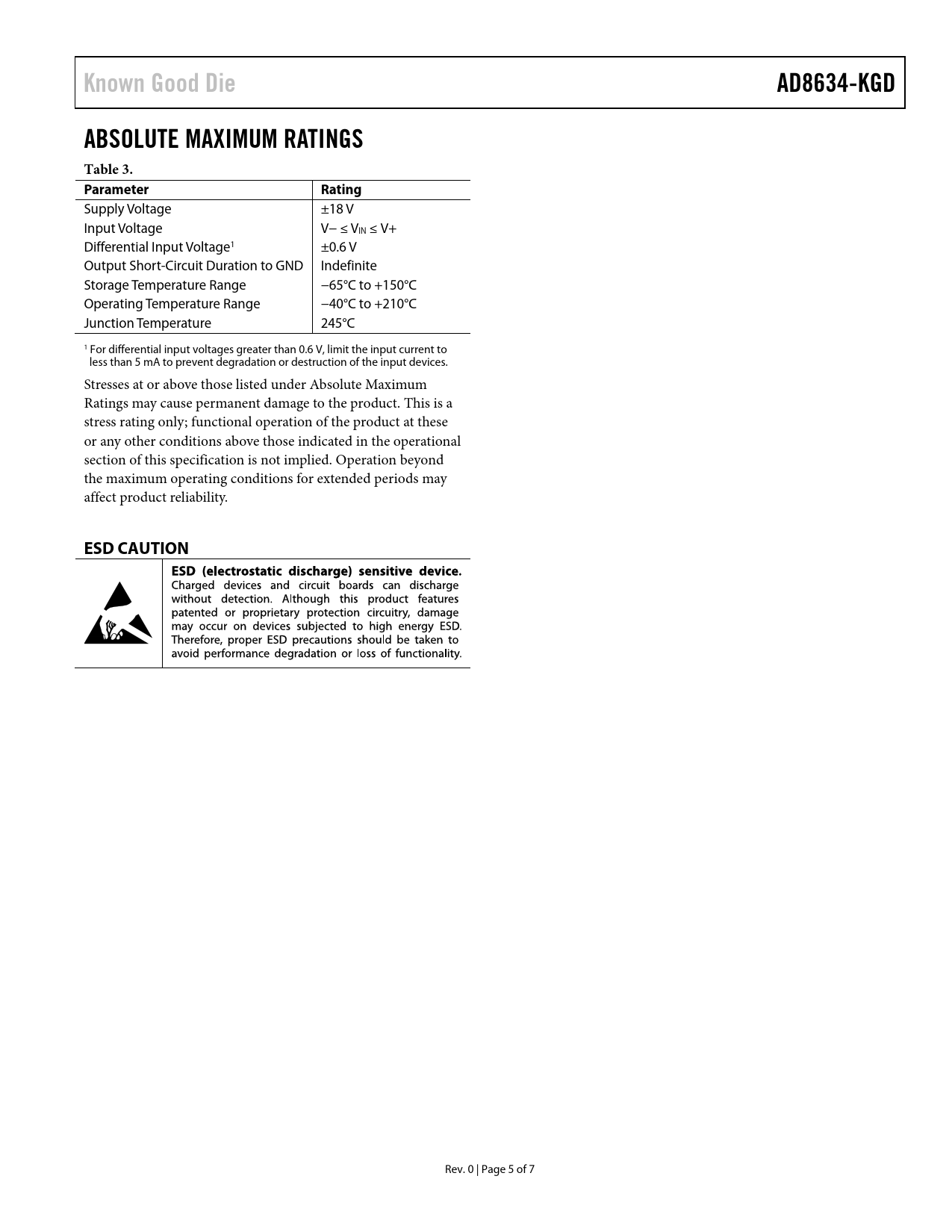 Known Good DieAD8634-KGDABSOLUTE MAXIMUM RATINGS Table 3.ParameterRating Supply Voltage ±18 V Input Voltage V− ≤ VIN ≤ V+ Differential Input Voltage1 ±0.6 V Output Short-Circuit Duration to GND Indefinite Storage Temperature Range −65°C to +150°C Operating Temperature Range −40°C to +210°C Junction Temperature 245°C 1 For differential input voltages greater than 0.6 V, limit the input current to less than 5 mA to prevent degradation or destruction of the input devices. Stresses at or above those listed under Absolute Maximum Ratings may cause permanent damage to the product. This is a stress rating only; functional operation of the product at these or any other conditions above those indicated in the operational section of this specification is not implied. Operation beyond the maximum operating conditions for extended periods may affect product reliability. ESD CAUTION Rev. 0 | Page 5 of 7 Document Outline Features Applications Metal Mask Die Image General Description Table of Contents Revision History Specifications Electrical Characteristics, VSY = ±15.0 V Electrical Characteristics, VSY = 5.0 V Absolute Maximum Ratings ESD Caution Pad Configuration And Function Descriptions Outline Dimensions Die Specifications and Assembly Recommendations Ordering Guide