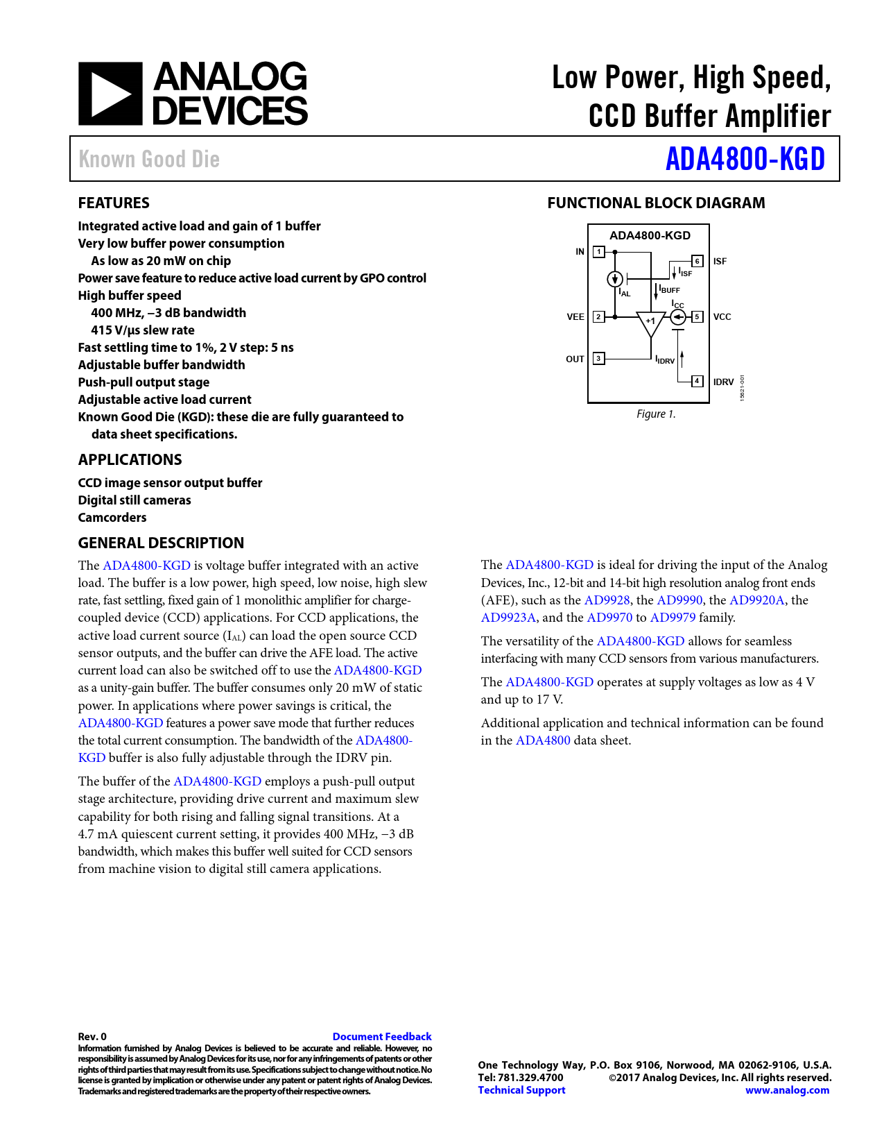 Low Power, High Speed,. CCD Buffer Amplifier. Known Good Die. ADA4800-KGD. FEATURES. FUNCTIONAL BLOCK DIAGRAM