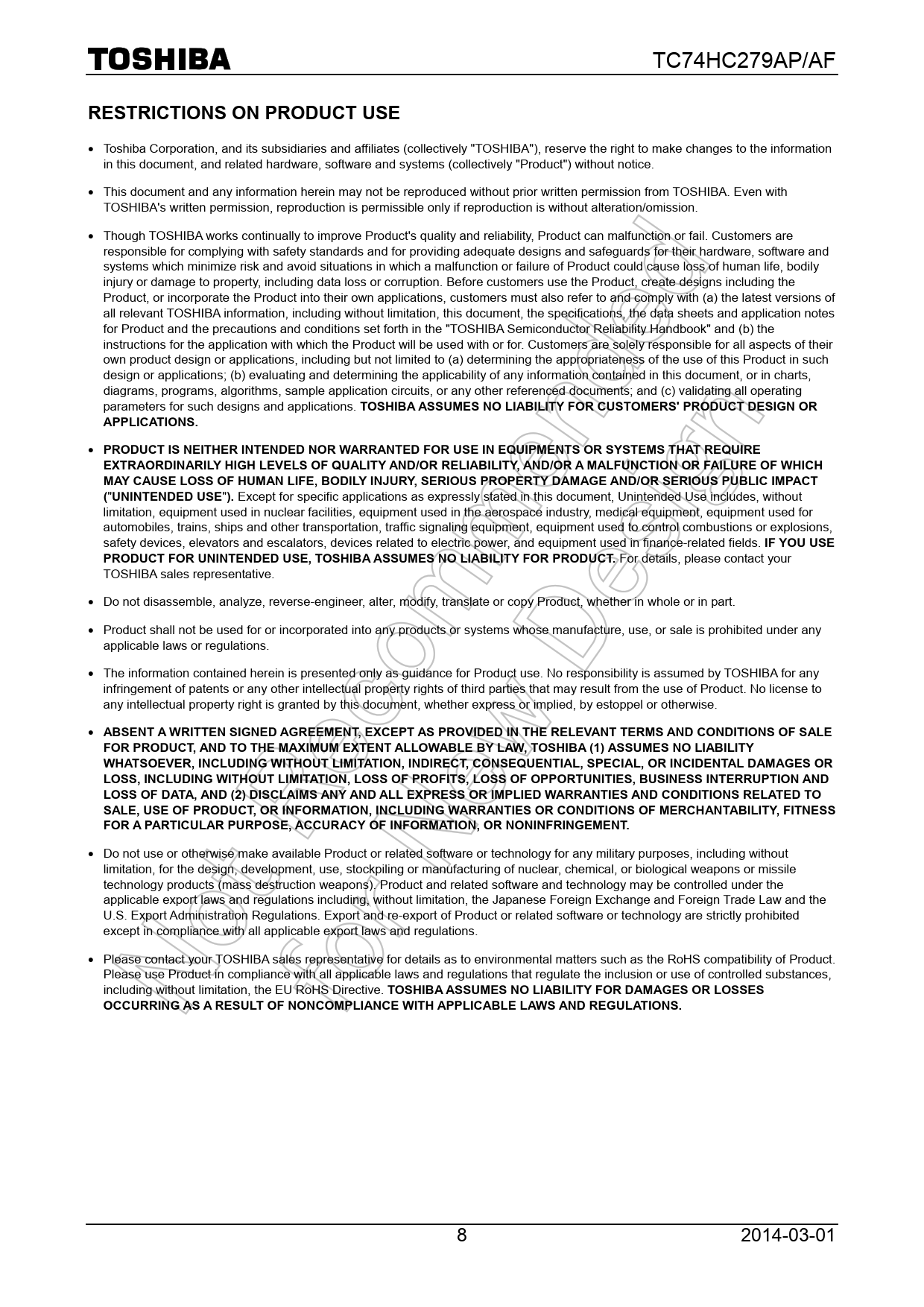 Páginas / Página8 / 8 — RESTRICTIONS ON PRODUCT USE. TOSHIBA ASSUMES NO LIABILITY FOR CUSTOMERS' …