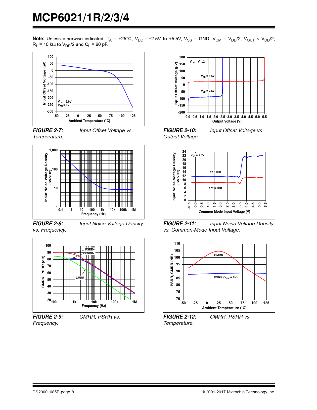 CMRR, PSRR vs. Frequency. Temperature. DS20001685E-page 8  2001-2017 Microchip Technology Inc. Document Outline Features Applications Design Aids Typical Application Description Package Types 1.0 Electrical Characteristics Absolute Maximum Ratings† DC Electrical Characteristics AC Electrical Characteristics MCP6023 Chip Select (CS) Electrical Characteristics Temperature Characteristics FIGURE 1-1: Timing Diagram for the CS Pin on the MCP6023. 1.1 Test Circuits FIGURE 1-2: AC and DC Test Circuit for Most Non-Inverting Gain Conditions. FIGURE 1-3: AC and DC Test Circuit for Most Inverting Gain Conditions. 2.0 Typical Performance Curves FIGURE 2-1: Input Offset Voltage (Industrial Temperature Parts). FIGURE 2-2: Input Offset Voltage (Extended Temperature Parts). FIGURE 2-3: Input Offset Voltage vs. Common-Mode Input Voltage with VDD = 2.5V. FIGURE 2-4: Input Offset Voltage Drift (Industrial Temperature Parts). FIGURE 2-5: Input Offset Voltage Drift (Extended Temperature Parts). FIGURE 2-6: Input Offset Voltage vs. Common-Mode Input Voltage with VDD = 5.5V. FIGURE 2-7: Input Offset Voltage vs. Temperature. FIGURE 2-8: Input Noise Voltage Density vs. Frequency. FIGURE 2-9: CMRR, PSRR vs. Frequency. FIGURE 2-10: Input Offset Voltage vs. Output Voltage. FIGURE 2-11: Input Noise Voltage Density vs. Common-Mode Input Voltage. FIGURE 2-12: CMRR, PSRR vs. Temperature. FIGURE 2-13: Input Bias, Offset Currents vs. Common-Mode Input Voltage. FIGURE 2-14: Quiescent Current vs. Supply Voltage. FIGURE 2-15: Output Short-Circuit Current vs. Supply Voltage. FIGURE 2-16: Input Bias, Offset Currents vs. Temperature. FIGURE 2-17: Quiescent Current vs. Temperature. FIGURE 2-18: Open-Loop Gain, Phase vs. Frequency. FIGURE 2-19: DC Open-Loop Gain vs. Load Resistance. FIGURE 2-20: Small Signal DC Open-Loop Gain vs. Output Voltage Headroom. FIGURE 2-21: Gain Bandwidth Product, Phase Margin vs. Temperature. FIGURE 2-22: DC Open-Loop Gain vs. Temperature. FIGURE 2-23: Gain Bandwidth Product, Phase Margin vs. Common-Mode Input Voltage. FIGURE 2-24: Gain Bandwidth Product, Phase Margin vs. Output Voltage. FIGURE 2-25: Slew Rate vs. Temperature. FIGURE 2-26: Total Harmonic Distortion plus Noise vs. Output Voltage with f = 1 kHz. FIGURE 2-27: The MCP6021/1R/2/3/4 Family Shows No Phase Reversal Under Overdrive. FIGURE 2-28: Maximum Output Voltage Swing vs. Frequency. FIGURE 2-29: Total Harmonic Distortion plus Noise vs. Output Voltage with f = 20 kHz. FIGURE 2-30: Channel-to-Channel Separation vs. Frequency (MCP6022 and MCP6024 only). FIGURE 2-31: Output Voltage Headroom vs. Output Current. FIGURE 2-32: Small Signal Non-Inverting Pulse Response. FIGURE 2-33: Large Signal Non-Inverting Pulse Response. FIGURE 2-34: Output Voltage Headroom vs. Temperature. FIGURE 2-35: Small Signal Inverting Pulse Response. FIGURE 2-36: Large Signal Inverting Pulse Response. FIGURE 2-37: VREF Accuracy vs. Supply Voltage (MCP6021 and MCP6023 only). FIGURE 2-38: Chip Select (CS) Hysteresis (MCP6023 only) with VDD = 2.5V. FIGURE 2-39: Chip Select (CS) to Amplifier Output Response Time (MCP6023 Only). FIGURE 2-40: VREF Accuracy vs. Temperature (MCP6021 and MCP6023 only). FIGURE 2-41: Chip Select (CS) Hysteresis (MCP6023 only) with VDD = 5.5V. FIGURE 2-42: Measured Input Current vs. Input Voltage (Below VSS) 3.0 Pin Descriptions TABLE 3-1: Pin Function Table 3.1 Analog Outputs 3.2 Analog Inputs 3.3 Reference Voltage (VREF) MCP6021 and MCP6023 3.4 Chip Select Digital Input (CS) 3.5 Power Supply (VSS and VDD) 4.0 Applications Information 4.1 Rail-to-Rail Input 4.1.1 Phase Reversal 4.1.2 Input Voltage Limits FIGURE 4-1: Simplified Analog Input ESD Structures. FIGURE 4-2: Protecting the Analog Inputs. 4.1.3 Input Current Limits FIGURE 4-3: Protecting the Analog Inputs. 4.1.4 Normal Operation 4.2 Rail-to-Rail Output 4.3 Capacitive Loads FIGURE 4-4: Output Resistor, RISO, Stabilizes Large Capacitive Loads. FIGURE 4-5: Recommended RISO Values for Capacitive Loads. 4.4 Gain Peaking FIGURE 4-6: Non-Inverting Gain Circuit with Parasitic Capacitance. FIGURE 4-7: Non-Inverting Gain Circuit with Parasitic Capacitance. 4.5 MCP6023 Chip Select (CS) 4.6 MCP6021 and MCP6023 Reference Voltage FIGURE 4-8: Simplified Internal VREF Circuit (MCP6021 and MCP6023 only). FIGURE 4-9: Non-Inverting Gain Circuit Using VREF (MCP6021 and MCP6023 only). FIGURE 4-10: Inverting Gain Circuit Using VREF (MCP6021 and MCP6023 only). 4.7 Supply Bypass 4.8 Unused Operational Amplifiers FIGURE 4-11: Unused Operational Amplifiers. 4.9 PCB Surface Leakage FIGURE 4-12: Example Guard Ring Layout. 4.10 High-Speed PCB Layout 4.11 Typical Applications 4.11.1 A/D Converter Driver and Anti-Aliasing Filter FIGURE 4-13: A/D Converter Driver and Anti-Aliasing Filter with a 20 kHz Cutoff Frequency. 4.11.2 Optical Detector Amplifier FIGURE 4-14: Transimpedance Amplifier for an Optical Detector. 5.0 Design Aids 5.1 SPICE Macro Model 5.2 FilterLab® Software 5.3 MPLAB® Mindi™ Analog Simulator 5.4 Microchip Advanced Part Selector (MAPS) 5.5 Analog Demonstration and Evaluation Boards 5.6 Application Notes 6.0 Packaging Information 6.1 Package Marking Information Package Marking Information (Continued) Package Marking Information (Continued) APPENDIX A: Revision History Revision E (January 2017) Revision D (February 2009) Revision C (December 2005) Revision B (November 2003) Revision A (November 2001) Product Identification System Worldwide Sales and Service