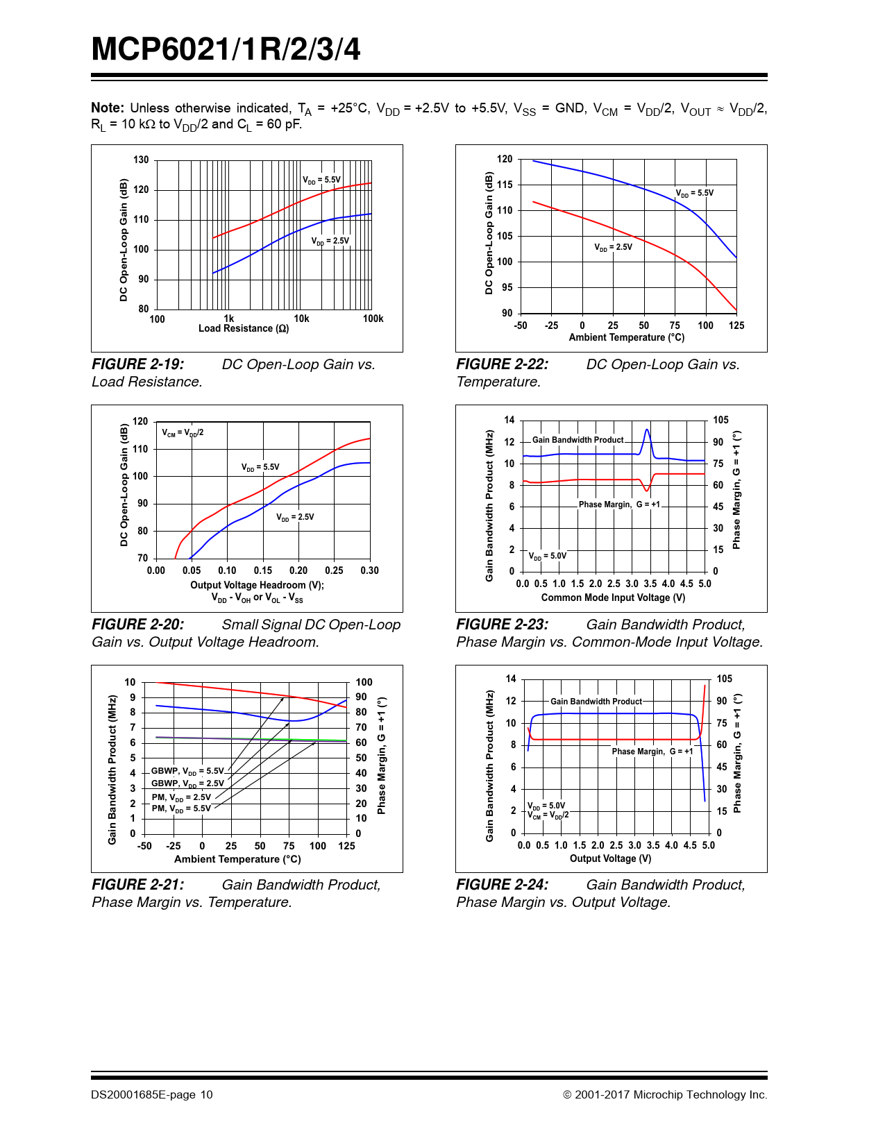 MCP6021/1R/2/3/4. Note:. 130. 120. = 5.5V. 115. 110. 105. = 2.5V. 100. DC Open-Loop Gain (dB). 10k. 100k. Load Resistance (. -50. -25. 125