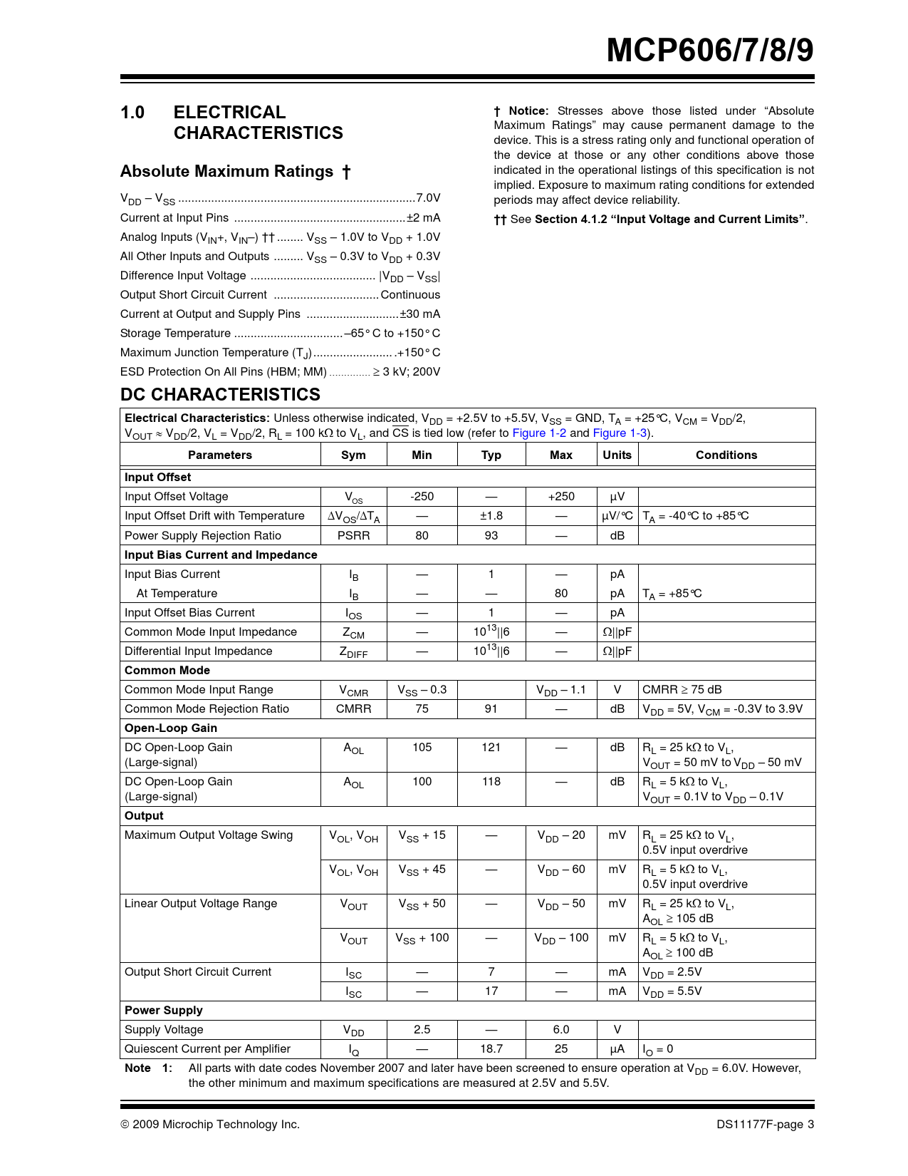 MCP606/7/8/9. 1.0. ELECTRICAL. † Notice:. CHARACTERISTICS. Absolute Maximum Ratings †