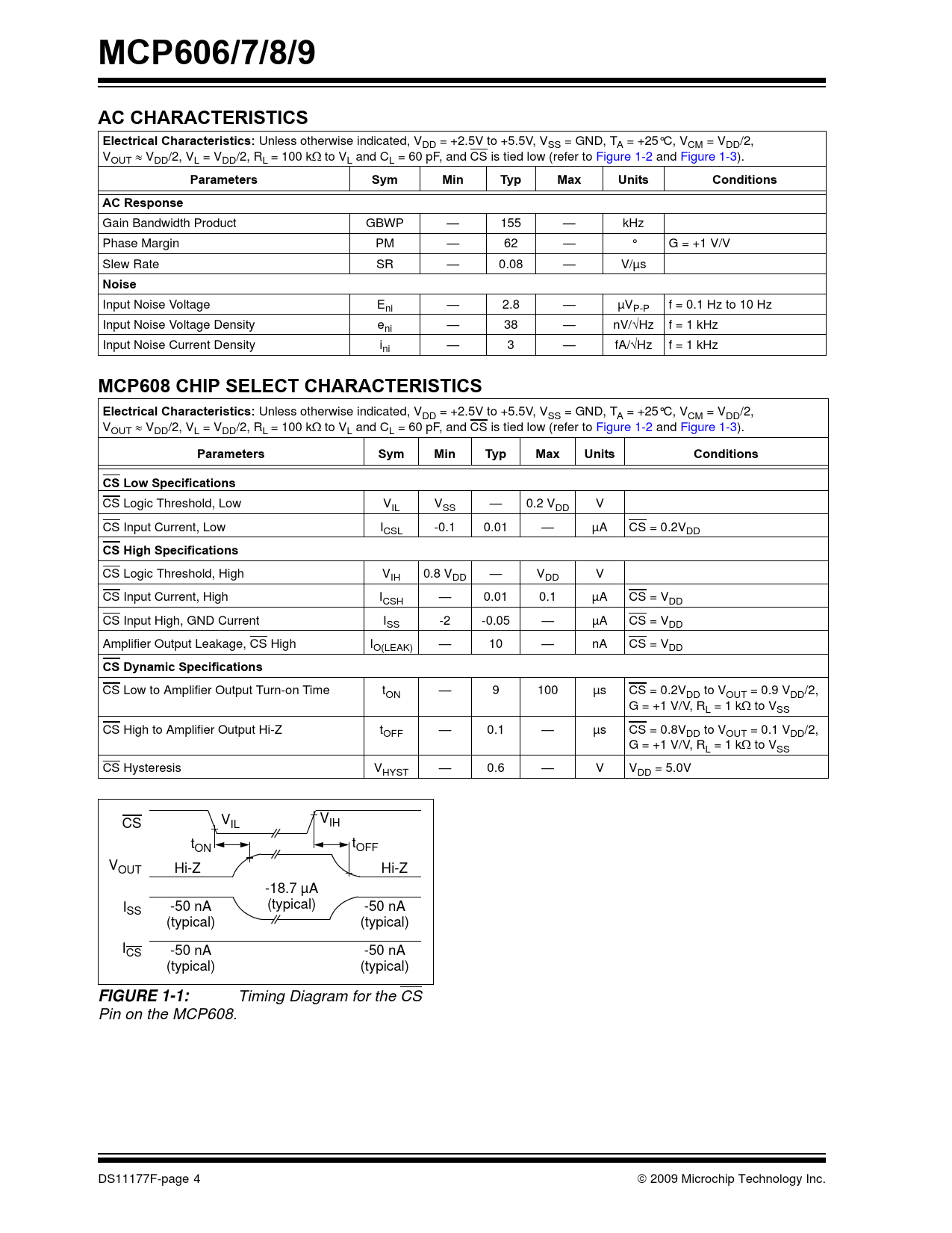 MCP606/7/8/9. AC CHARACTERISTICS. Electrical Characteristics:. Parameters. Sym. Min. Typ. Max. Units. Conditions. AC Response. Noise