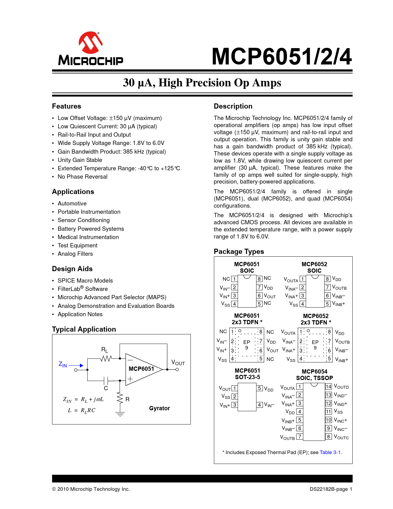 MCP6051/2/4. 30 µA, High Precision Op Amps. Features. Description. Applications. Package Types. MCP6051. MCP6052. Design Aids. SOIC
