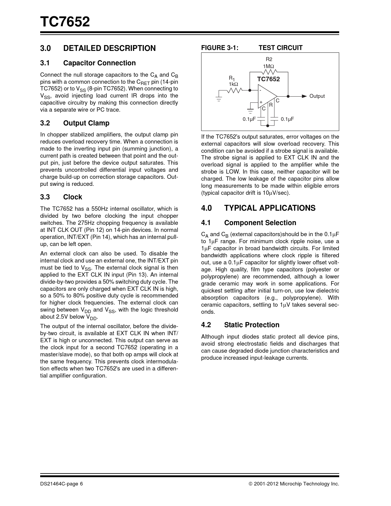 TC76523.0DETAILED DESCRIPTIONFIGURE 3-1:TEST CIRCUIT R2 3.1Capacitor Connection 1MΩ Connect the null storage capacitors to the CA and CB R pins with a common connection to the C 1 TC7652 RET pin (14-pin 1kΩ TC7652) or to V - SS (8-pin TC7652). When connecting to VSS, avoid injecting load current IR drops into the Output + capacitive circuitry by making this connection directly C R via a separate wire or PC trace. C 0.1µF 0.1µF 3.2Output Clamp In chopper stabilized amplifiers, the output clamp pin If the TC7652's output saturates, error voltages on the reduces overload recovery time. When a connection is external capacitors will slow overload recovery. This made to the inverting input pin (summing junction), a condition can be avoided if a strobe signal is available. current path is created between that point and the out- The strobe signal is applied to EXT CLK IN and the put pin, just before the device output saturates. This overload signal is applied to the amplifier while the prevents uncontrolled differential input voltages and strobe is LOW. In this case, neither capacitor will be charge build-up on correction storage capacitors. Out- charged. The low leakage of the capacitor pins allow put swing is reduced. long measurements to be made within eligible errors (typical capacitor drift is 10V/sec). 3.3Clock The TC7652 has a 550Hz internal oscillator, which is 4.0TYPICAL APPLICATIONS divided by two before clocking the input chopper switches. The 275Hz chopping frequency is available 4.1Component Selection at INT CLK OUT (Pin 12) on 14-pin devices. In normal operation, INT/EXT (Pin 14), which has an internal pull- CA and CB (external capacitors)should be in the 0.1F up, can be left open. to 1F range. For minimum clock ripple noise, use a 1F capacitor in broad bandwidth circuits. For limited An external clock can also be used. To disable the bandwidth applications where clock ripple is filtered internal clock and use an external one, the INT/EXT pin out, use a 0.1F capacitor for slightly lower offset volt- must be tied to VSS. The external clock signal is then age. High quality, film type capacitors (polyester or applied to the EXT CLK IN input (Pin 13). An internal polypropylene) are recommended, although a lower divide-by-two provides a 50% switching duty cycle. The grade ceramic may work in some applications. For capacitors are only charged when EXT CLK IN is high, quickest settling after initial turn-on, use low dielectric so a 50% to 80% positive duty cycle is recommended absorption capacitors (e.g., polypropylene). With for higher clock frequencies. The external clock can ceramic capacitors, settling to 1V takes several sec- swing between VDD and VSS, with the logic threshold onds. about 2.5V below VDD. The output of the internal oscillator, before the divide- 4.2Static Protection by-two circuit, is available at EXT CLK IN when INT/ Although input diodes static protect all device pins, EXT is high or unconnected. This output can serve as avoid strong electrostatic fields and discharges that the clock input for a second TC7652 (operating in a can cause degraded diode junction characteristics and master/slave mode), so that both op amps will clock at produce increased input-leakage currents. the same frequency. This prevents clock intermodula- tion effects when two TC7652's are used in a differen- tial amplifier configuration. DS21464C-page 6 2001-2012 Microchip Technology Inc. Document Outline 1.0 Electrical Characteristics 2.0 pin descriptions TABLE 2-1: pin function table 3.0 detailed description 3.1 Capacitor Connection 3.2 Output Clamp 3.3 Clock Figure 3-1: TEST CIRCUIT 4.0 TYPICAL APPLICATIONS 4.1 Component Selection 4.2 Static Protection 4.3 Output Stage/Load Driving Figure 4-1: CONNECTION OF INPUT GUARDS 4.4 Thermoelectric Effects 4.5 Guarding 4.6 Pin Compatibility 4.7 Some Applications Figure 4-2: Noninverting amplifier with optional clamp Figure 4-3: inverting amplifier with optional clamp Figure 4-4: using 741 to boost output drive capability Figure 4-5: low offset comparator Figure 4-6: 1437 offset nulled by tc7652 Figure 4-7: splitting +15v with the 7660 at >95% efficiency 5.0 typical characteristics 6.0 packaging information 6.1 Package Marking Information 6.2 Package Dimensions 7.0 Revision History Corporate Office Atlanta Boston Chicago Cleveland Fax: 216-447-0643 Dallas Detroit Indianapolis Toronto Fax: 852-2401-3431 Australia - Sydney China - Beijing China - Shanghai India - Bangalore Korea - Daegu Korea - Seoul Singapore Taiwan - Taipei Fax: 43-7242-2244-393 Denmark - Copenhagen France - Paris Germany - Munich Italy - Milan Spain - Madrid UK - Wokingham Worldwide Sales and Service