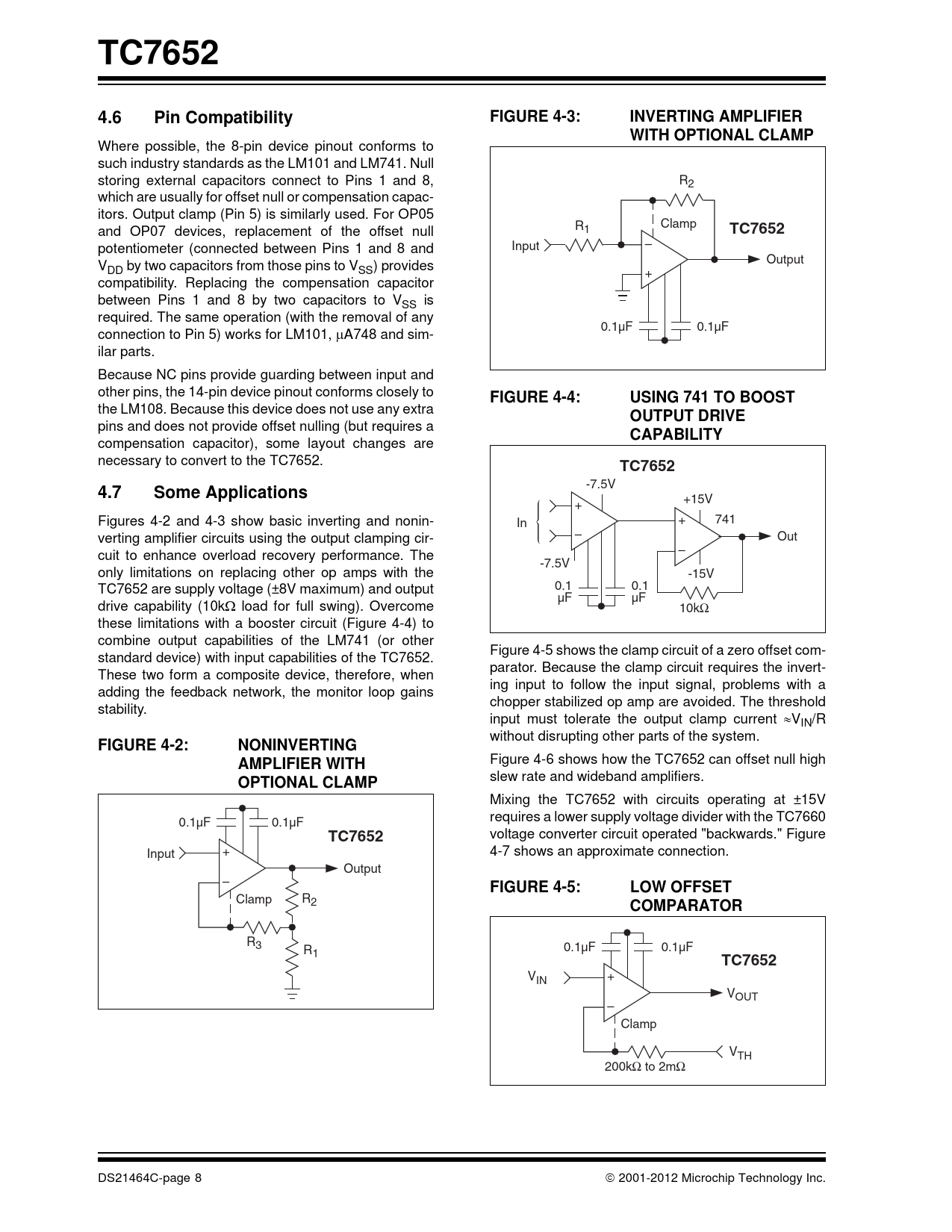 TC7652. 4.6. Pin Compatibility. FIGURE 4-3:. INVERTING AMPLIFIER WITH OPTIONAL CLAMP. FIGURE 4-4:. USING 741 TO BOOST. OUTPUT DRIVE