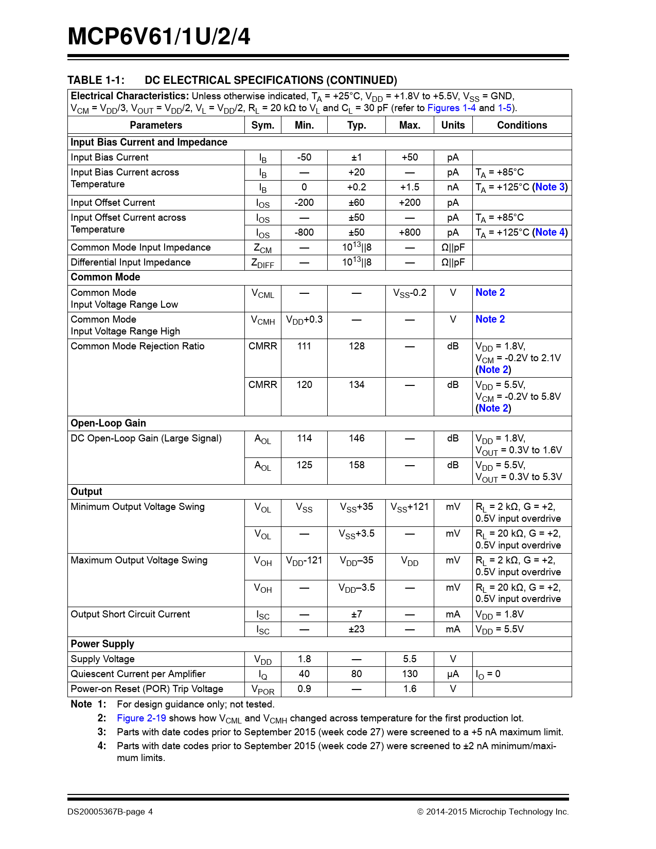 MCP6V61/1U/2/4 TABLE 1-1: DC ELECTRICAL SPECIFICATIONS (CONTINUED) Electrical Characteristics: