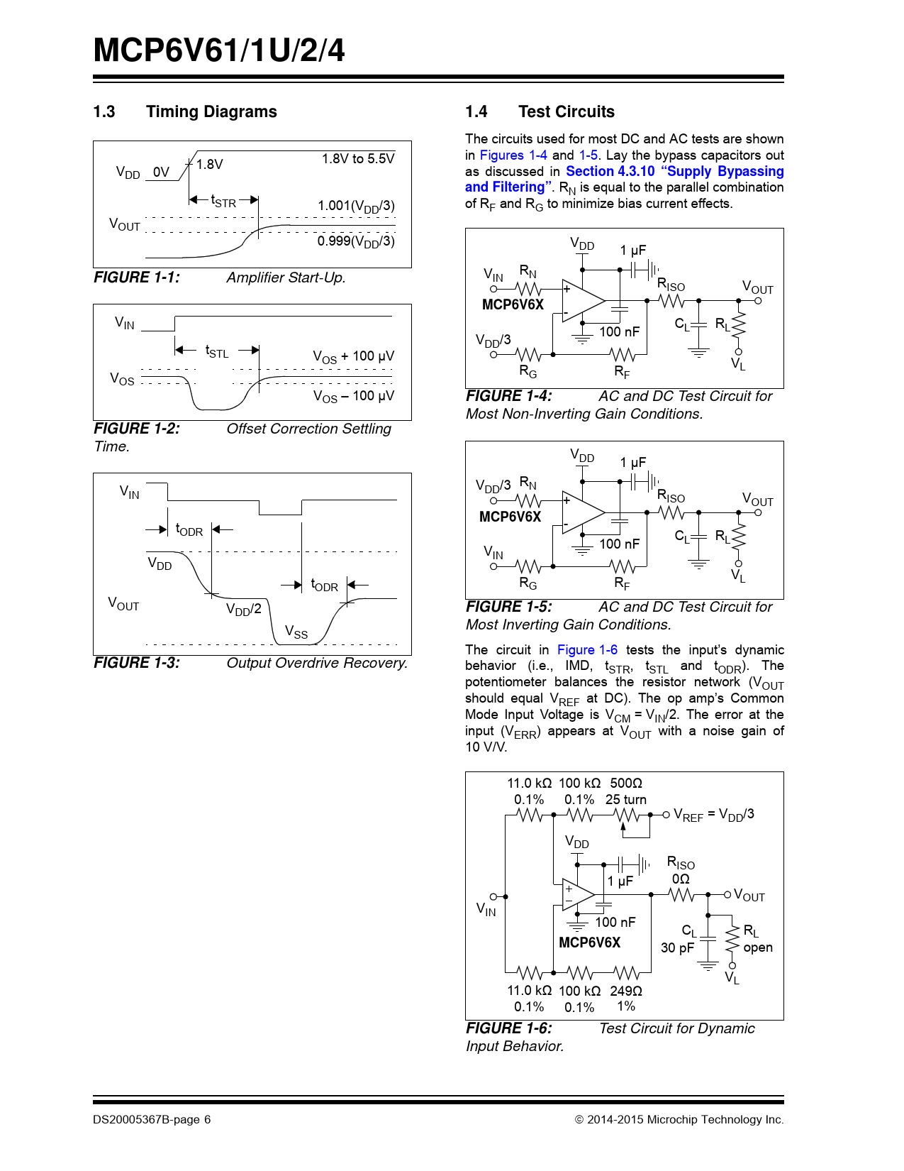 MCP6V61/1U/2/4. 1.3. Timing Diagrams. 1.4. Test Circuits. Section 4.3.10 “Supply Bypassing. and Filtering”. FIGURE 1-1:. MCP6V6X