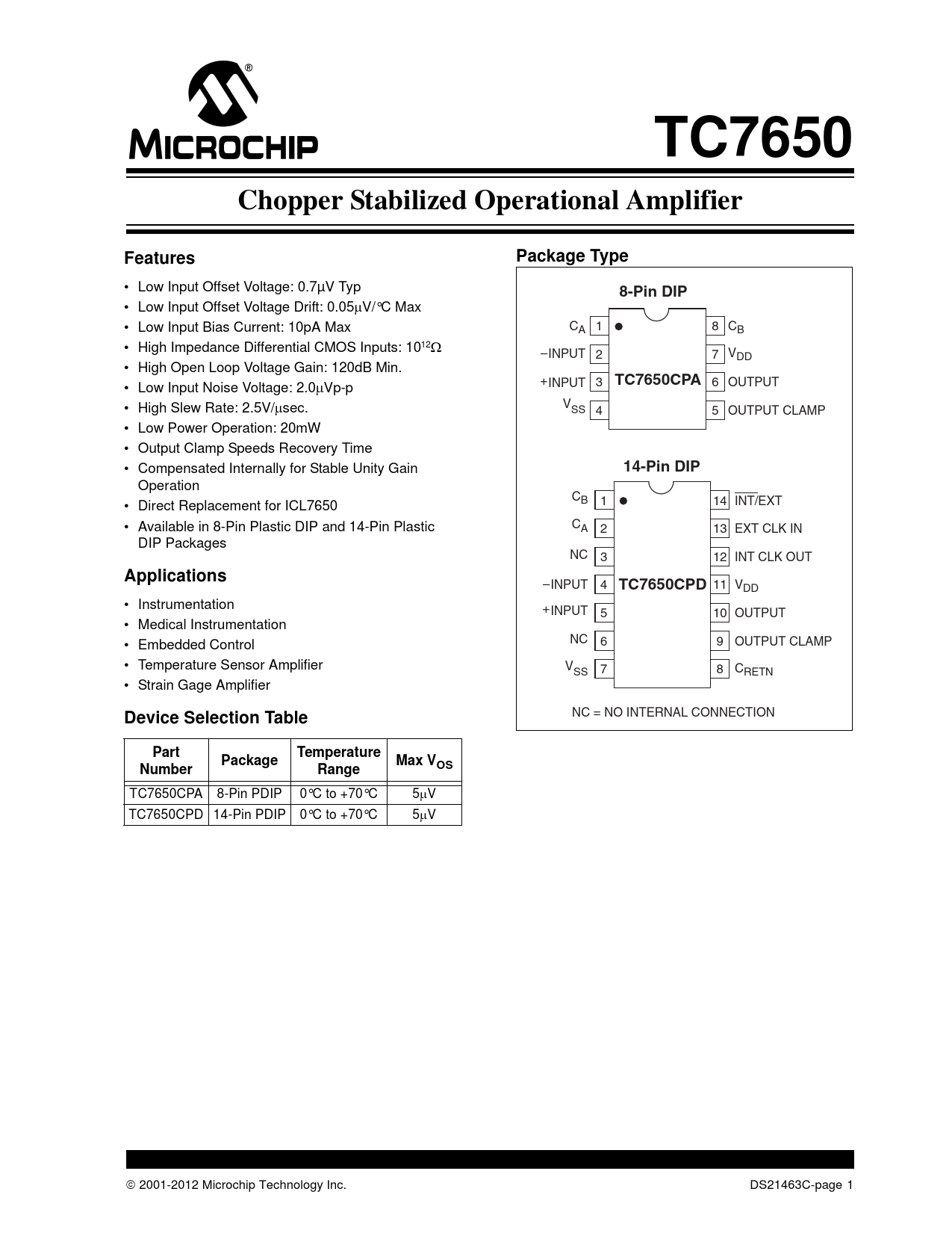TC7650. Chopper Stabilized Operational Amplifier. Features. Package Type. 8-Pin DIP. TC7650CPA. 14-Pin DIP. Applications. TC7650CPD