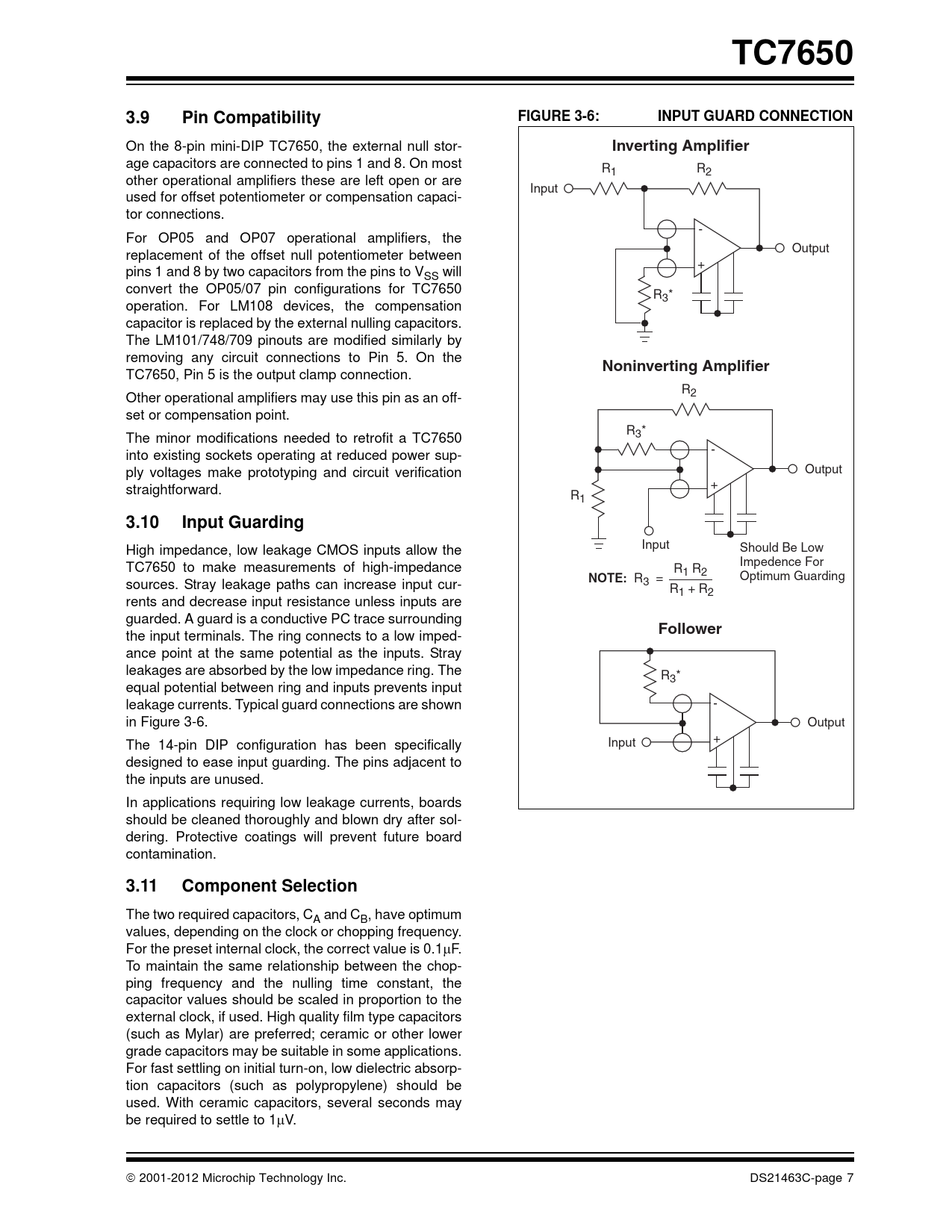 TC7650 3.9 Pin Compatibility FIGURE 3-6: INPUT GUARD CONNECTION Inverting Amplifier Noninverting Amplifier 3.10 Input Guarding