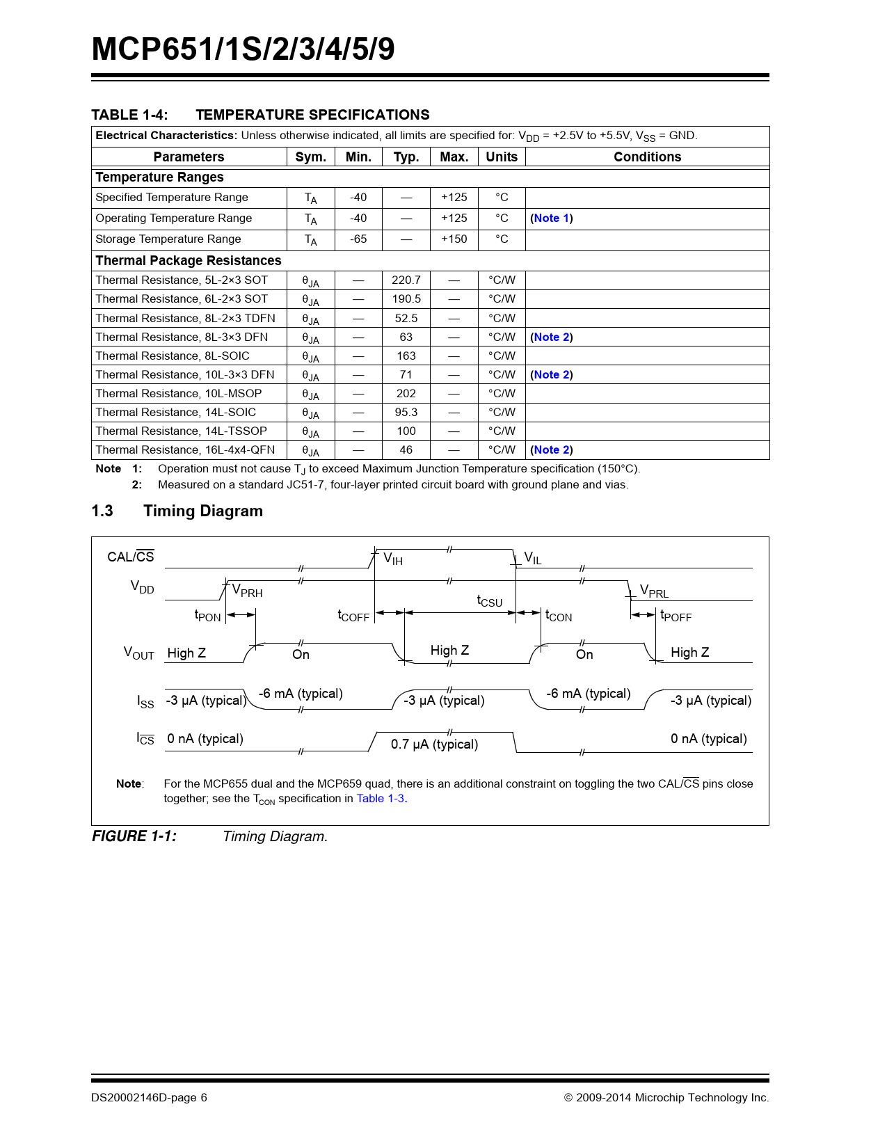 Timing Diagram. DS20002146D-page 6  2009-2014 Microchip Technology Inc. Document Outline 50 MHz, 200 µV Op Amps with mCal Features Typical Applications Design Aids Description Typical Application Circuit High Gain-Bandwidth Op Amp Portfolio Package Types 1.0 Electrical Characteristics 1.1 Absolute Maximum Ratings † 1.2 Specifications TABLE 1-1: DC Electrical Specifications TABLE 1-2: AC Electrical Specifications TABLE 1-3: Digital Electrical Specifications TABLE 1-4: Temperature Specifications 1.3 Timing Diagram FIGURE 1-1: Timing Diagram. 1.4 Test Circuits FIGURE 1-2: AC and DC Test Circuit for Most Specifications. 2.0 Typical Performance Curves 2.1 DC Signal Inputs FIGURE 2-1: Input Offset Voltage. FIGURE 2-2: Input Offset Voltage Drift. FIGURE 2-3: Input Offset Voltage Repeatability (repeated calibration). FIGURE 2-4: Input Offset Voltage vs. Power Supply Voltage. FIGURE 2-5: Input Offset Voltage vs. Output Voltage. FIGURE 2-6: Low-Input Common Mode Voltage Headroom vs. Ambient Temperature. FIGURE 2-7: High-Input Common Mode Voltage Headroom vs. Ambient Temperature. FIGURE 2-8: Input Offset Voltage vs. Common Mode Voltage with VDD = 2.5V. FIGURE 2-9: Input Offset Voltage vs. Common Mode Voltage with VDD = 5.5V. FIGURE 2-10: CMRR and PSRR vs. Ambient Temperature. FIGURE 2-11: DC Open-Loop Gain vs. Ambient Temperature. FIGURE 2-12: Input Bias and Offset Currents vs. Ambient Temperature with VDD = +5.5V. FIGURE 2-13: Input Bias and Offset Currents vs. Common Mode Input Voltage with TA = +85°C. FIGURE 2-14: Input Bias and Offset Currents vs. Common Mode Input Voltage with TA = +125°C. FIGURE 2-15: Input Bias Current vs. Input Voltage (below VSS). 2.2 Other DC Voltages and Currents FIGURE 2-16: Ratio of Output Voltage Headroom to Output Current. FIGURE 2-17: Output Voltage Headroom vs. Ambient Temperature. FIGURE 2-18: Output Short-Circuit Current vs. Power Supply Voltage. FIGURE 2-19: Supply Current vs. Power Supply Voltage. FIGURE 2-20: Supply Current vs. Common Mode Input Voltage. FIGURE 2-21: Power-On Reset Voltages vs. Ambient Temperature. FIGURE 2-22: Normalized Internal Calibration Voltage. FIGURE 2-23: VCAL Input Resistance vs. Temperature. 2.3 Frequency Response FIGURE 2-24: CMRR and PSRR vs. Frequency. FIGURE 2-25: Open-Loop Gain vs. Frequency. FIGURE 2-26: Gain-Bandwidth Product and Phase Margin vs. Ambient Temperature. FIGURE 2-27: Gain-Bandwidth Product and Phase Margin vs. Common Mode Input Voltage. FIGURE 2-28: Gain-Bandwidth Product and Phase Margin vs. Output Voltage. FIGURE 2-29: Closed-Loop Output Impedance vs. Frequency. FIGURE 2-30: Gain Peaking vs. Normalized Capacitive Load. FIGURE 2-31: Channel-to-Channel Separation vs. Frequency. 2.4 Input Noise and Distortion FIGURE 2-32: Input Noise Voltage Density vs. Frequency. FIGURE 2-33: Input Noise Voltage Density vs. Input Common Mode Voltage with f = 100 Hz. FIGURE 2-34: Input Noise Voltage Density vs. Input Common Mode Voltage with f = 1 MHz. FIGURE 2-35: Input Noise plus Offset vs. Time with 0.1 Hz Filter. FIGURE 2-36: THD+N vs. Frequency. 2.5 Time Response FIGURE 2-37: Non-inverting Small Signal Step Response. FIGURE 2-38: Non-inverting Large Signal Step Response. FIGURE 2-39: Inverting Small Signal Step Response. FIGURE 2-40: Inverting Large Signal Step Response. FIGURE 2-41: The MCP651/1S/2/3/4/5/9 family shows no input phase reversal with overdrive. FIGURE 2-42: Slew Rate vs. Ambient Temperature. FIGURE 2-43: Maximum Output Voltage Swing vs. Frequency. 2.6 Calibration and Chip Select Response FIGURE 2-44: CAL/CS Current vs. Power Supply Voltage. FIGURE 2-45: CAL/CS Voltage, Output Voltage and Supply Current (for Side A) vs. Time with VDD = 2.5V. FIGURE 2-46: CAL/CS Voltage, Output Voltage and Supply Current (for Side A) vs. Time with VDD = 5.5V. FIGURE 2-47: CAL/CS Hysteresis vs. Ambient Temperature. FIGURE 2-48: CAL/CS Turn-On Time vs. Ambient Temperature. FIGURE 2-49: CAL/CS’s Pull-Down Resistor (RPD) vs. Ambient Temperature. FIGURE 2-50: Quiescent Current in Shutdown vs. Power Supply Voltage. FIGURE 2-51: Output Leakage Current vs. Output Voltage. 3.0 Pin Descriptions TABLE 3-1: Pin Function Table 3.1 Analog Outputs 3.2 Analog Inputs 3.3 Power Supply Pins 3.4 Calibration Common Mode Voltage Input 3.5 Calibrate/Chip Select Digital Input 3.6 Exposed Thermal Pad (EP) 4.0 Applications 4.1 Calibration and Chip Select FIGURE 4-1: Common-Mode Reference’s Input Circuitry. FIGURE 4-2: Setting VCM with External Resistors. 4.2 Input FIGURE 4-3: Simplified Analog Input ESD Structures. FIGURE 4-4: Protecting the Analog Inputs. FIGURE 4-5: Unity-Gain Voltage Limitations for Linear Operation. 4.3 Rail-to-Rail Output FIGURE 4-6: Output Current. FIGURE 4-7: Diagram for Resistive Load Power Calculations. FIGURE 4-8: Diagram for Capacitive Load Power Calculations. 4.4 Improving Stability FIGURE 4-9: Output Resistor, RISO Stabilizes Large Capacitive Loads. FIGURE 4-10: Recommended RISO Values for Capacitive Loads. FIGURE 4-11: Amplifier with Parasitic Capacitance. FIGURE 4-12: Maximum Recommended RF vs. Gain. 4.5 Power Supply 4.6 High-Speed PCB Layout 4.7 Typical Applications FIGURE 4-13: Power Driver. FIGURE 4-14: Transimpedance Amplifier for an Optical Detector. FIGURE 4-15: H-Bridge Driver. 5.0 Design Aids 5.1 SPICE Macro Model 5.2 FilterLab® Software 5.3 Microchip Advanced Part Selector (MAPS) 5.4 Analog Demonstration and Evaluation Boards 5.5 Application Notes 6.0 Packaging Information 6.1 Package Marking Information 6.2 Package Marking Information Appendix A: Revision History Product Identification System Trademarks Worldwide Sales and Service