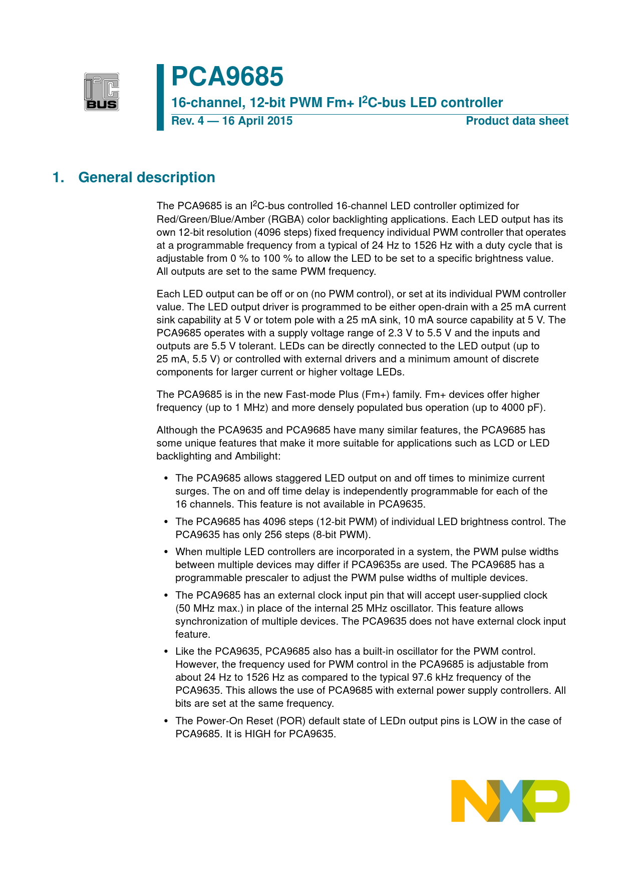 PCA9685 16-channel, 12-bit PWM Fm+ I2C-bus LED controller. Rev. 4 — 16 April 2015. Product data sheet. 1. General. description