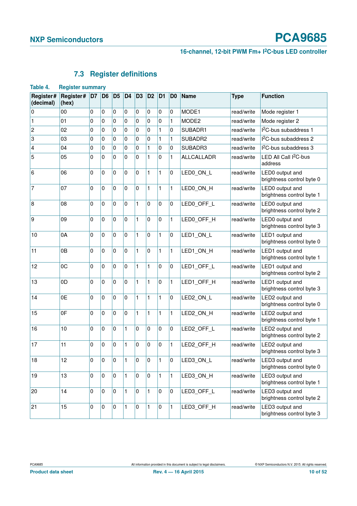NXP Semiconductors. PCA9685. 16-channel, 12-bit PWM Fm+ I2C-bus LED controller. 7.3 Register definitions. Table 4