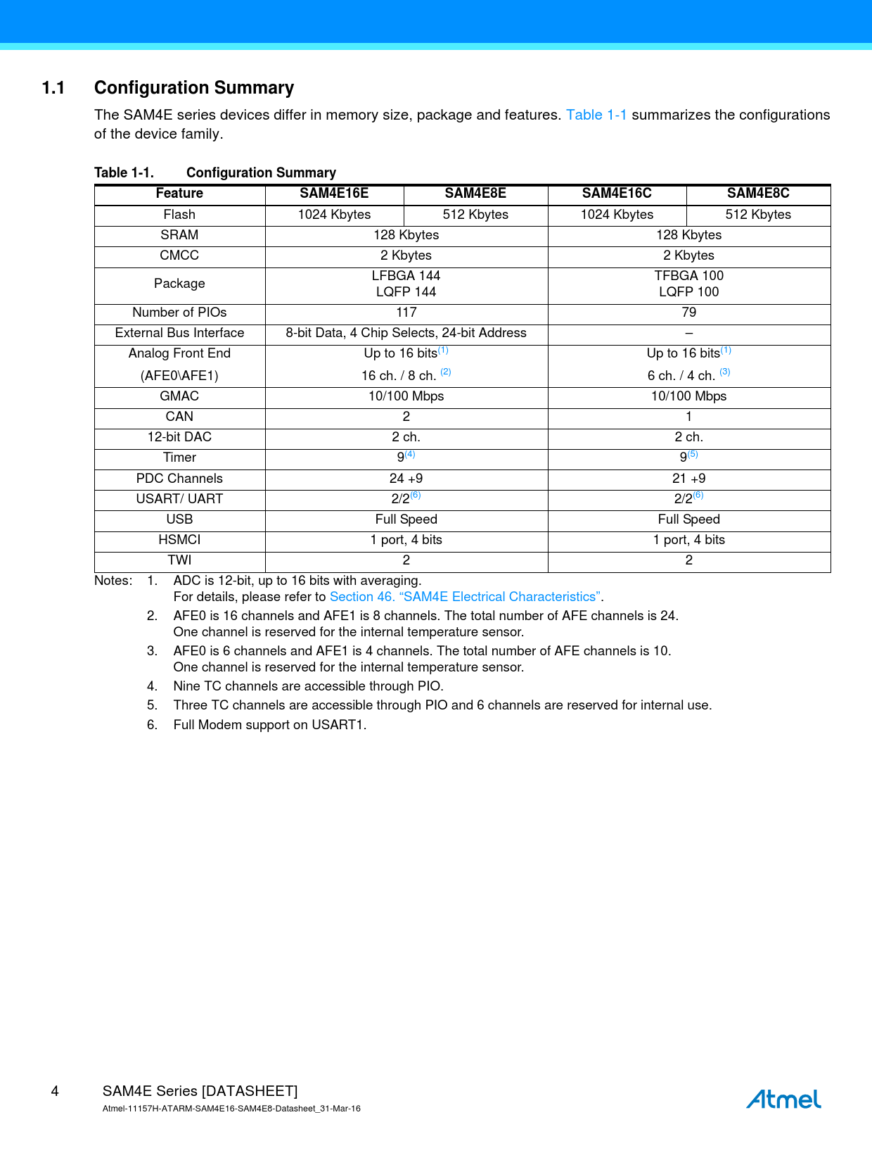 The SAM4E series devices differ in memory size, package and features. Table 1-1 summarizes the configurations of the device family.