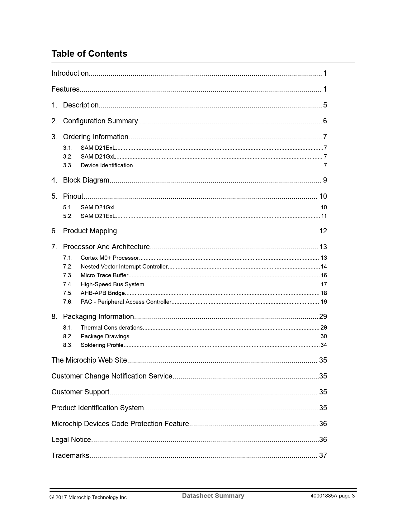 Introduction..1 Features.. 1 1. Description...5 2. Configuration Summary...6 3. Ordering Information..7 3.1. SAM D21ExL..7 3.2. SAM D21GxL... 7 3.3. Device Identification... 7 4. Block Diagram... 9 5. Pinout.. 10 5.1. SAM D21GxL... 10 5.2. SAM D21ExL.. 11 6. Product Mapping... 12 7. Processor And Architecture...13 7.1. Cortex M0+ Processor... 13 7.2. Nested Vector Interrupt Controller..14 7.3. Micro Trace Buffer.. 16 7.4. High-Speed Bus System.. 17 7.5. AHB-APB Bridge.. 18 7.6. PAC - Peripheral Access Controller... 19 8. Packaging Information...29 8.1. Thermal Considerations... 29 8.2. Package Drawings... 30 8.3. Soldering Profile... 34 The Microchip Web Site.. 35 Customer Change Notification Service..35 Customer Support... 35 Product Identification System..35 Microchip Devices Code Protection Feature... 36 Legal Notice...36 Trademarks... 37 © 2017 Microchip Technology Inc.