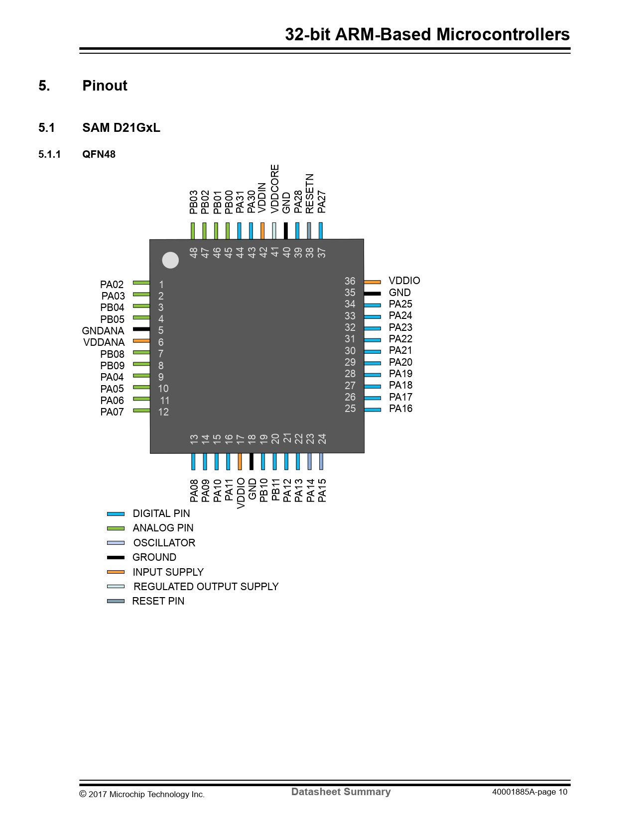 32-bit ARM-Based Microcontrollers. Pinout. 5.1. SAM D21GxL. 5.1.1. QFN48. Datasheet Summary