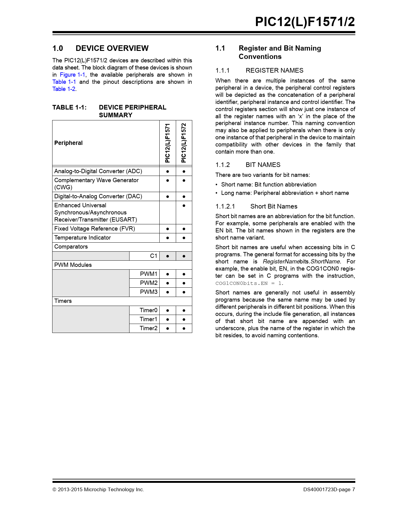 PIC12(L)F1571/2. 1.0. DEVICE OVERVIEW. 1.1. Register and Bit Naming Conventions. TABLE 1-1:. DEVICE PERIPHERAL. SUMMARY. Peripheral