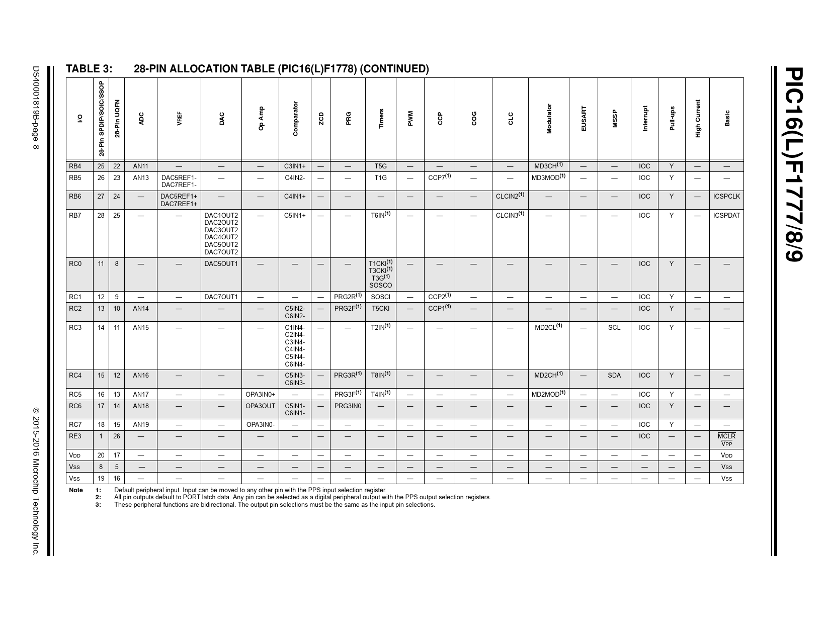 | Páginas / Página | 630 / 8 — PIC16(L)F1777/8. TABLE 3:. 28-PIN ALLOCATION TABLE (PIC16(L)F1778) … |